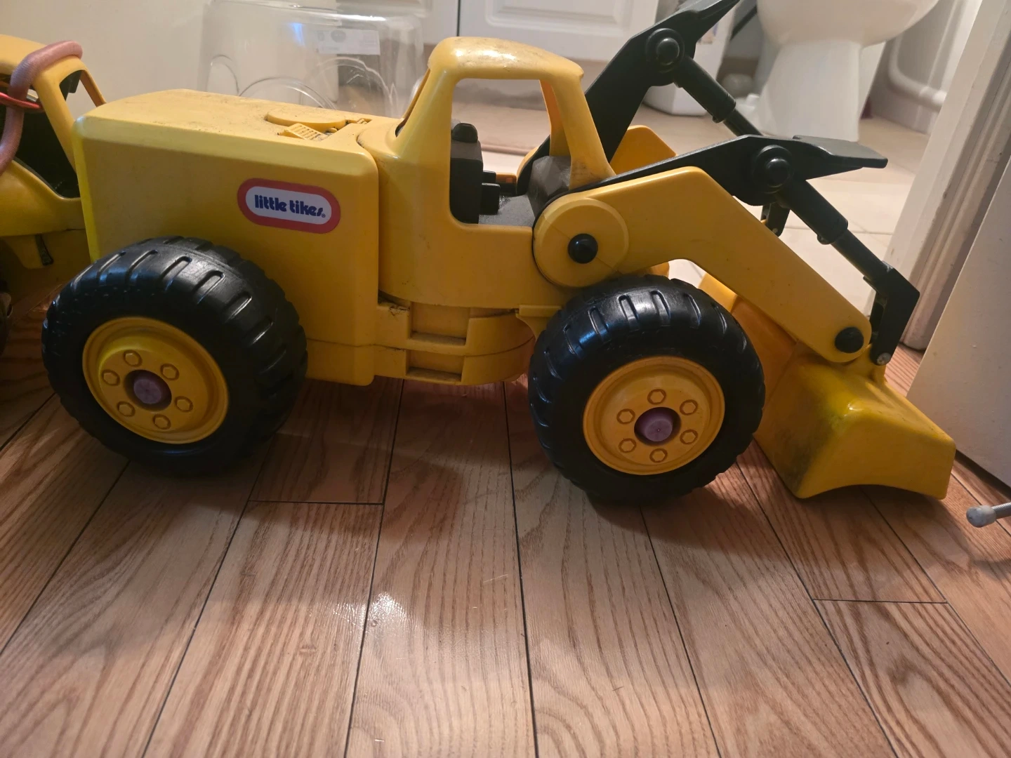 This is a Little Tikes yellow dump truck and loader toy. It's made of durable plastic and is perfect for outdoor play. Kids can use it to haul dirt, sand, or toys. It's a classic toy for imaginative adventures!