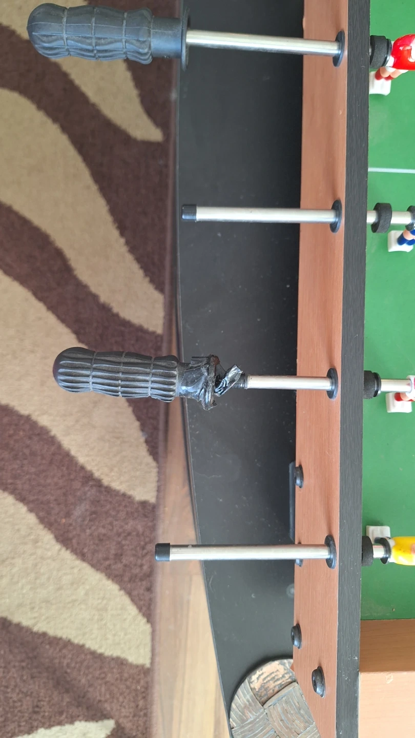 This is a compact tabletop foosball game. It features red and yellow player figures on a green pitch with a wooden-style exterior. Score markers are included at each end. One handle shows some wear and tape repair.