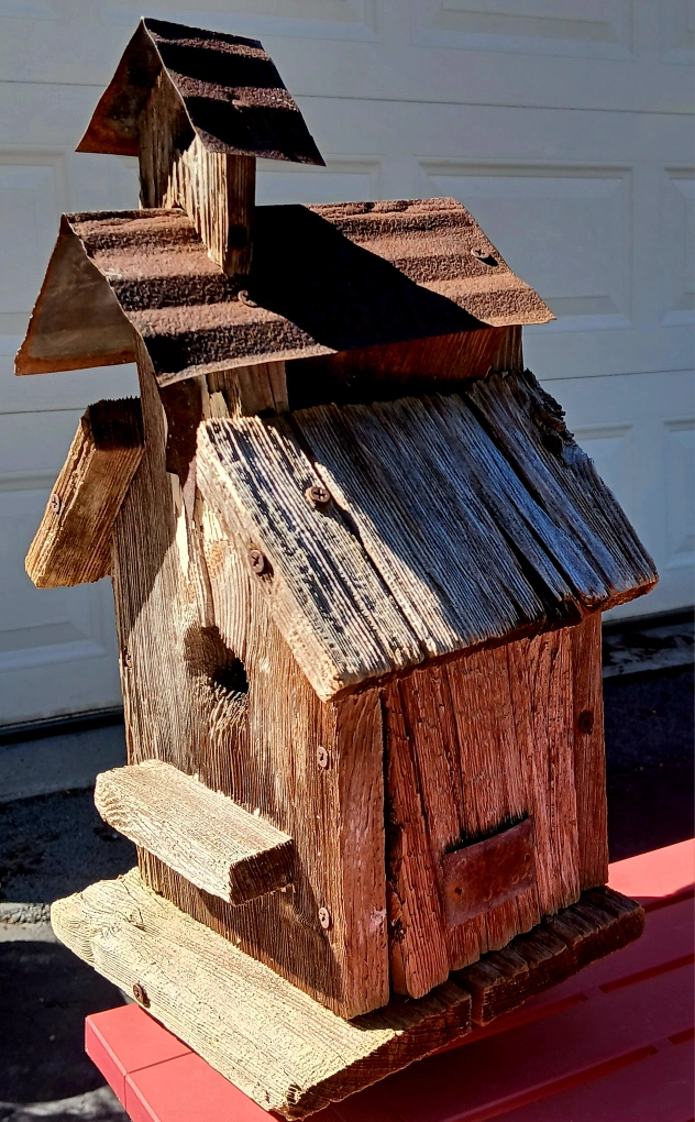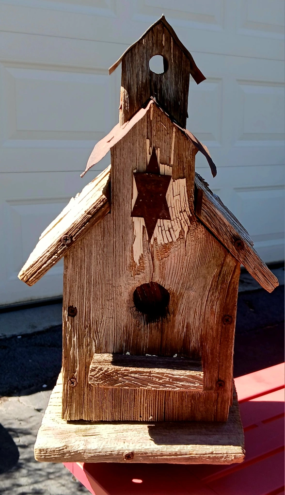 This is a charming, rustic birdhouse made of wood. It has a unique, weathered look that would add character to any garden or outdoor space. It features a multi-tiered roof and a small perch for birds to rest on. It's a great piece for bird lovers and garden enthusiasts alike.