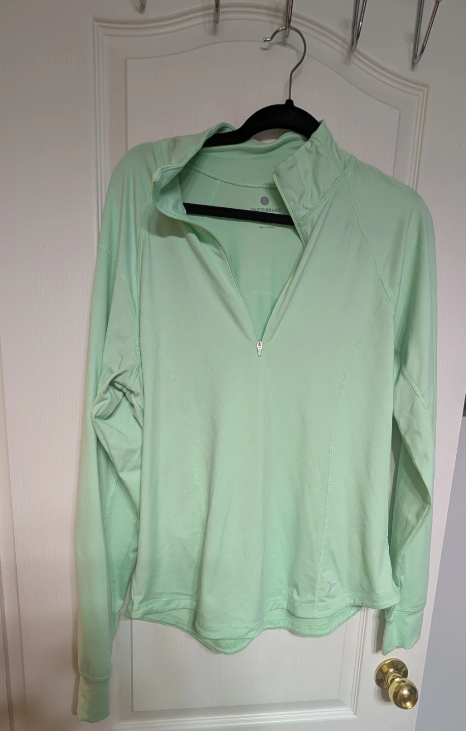 This is an Old Navy Active long sleeve zip-up shirt in a light mint green colour. It's a size XL with a semi-fitted cut. It's made from a lightweight, breathable fabric.