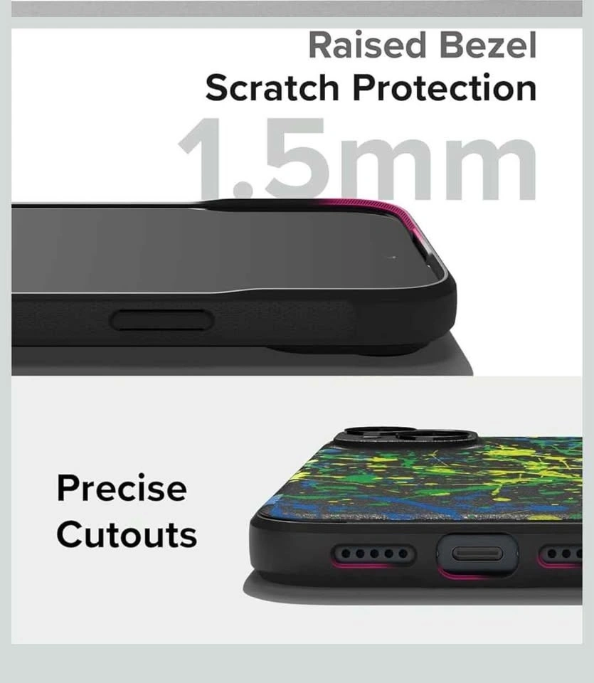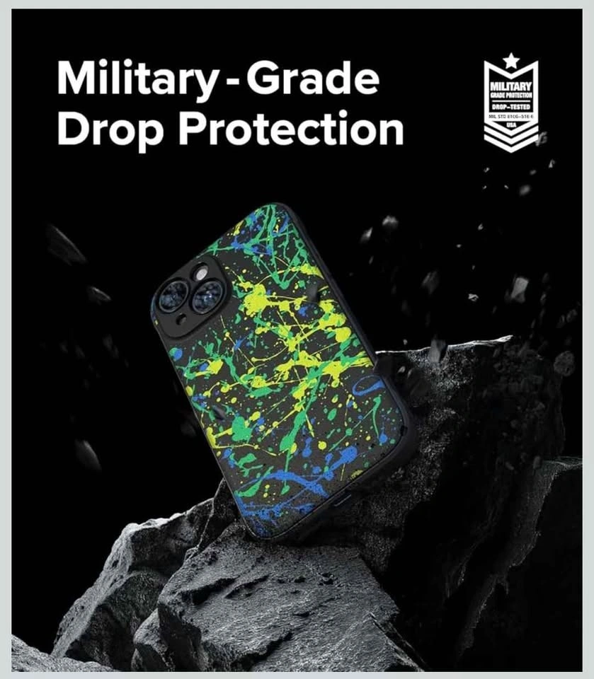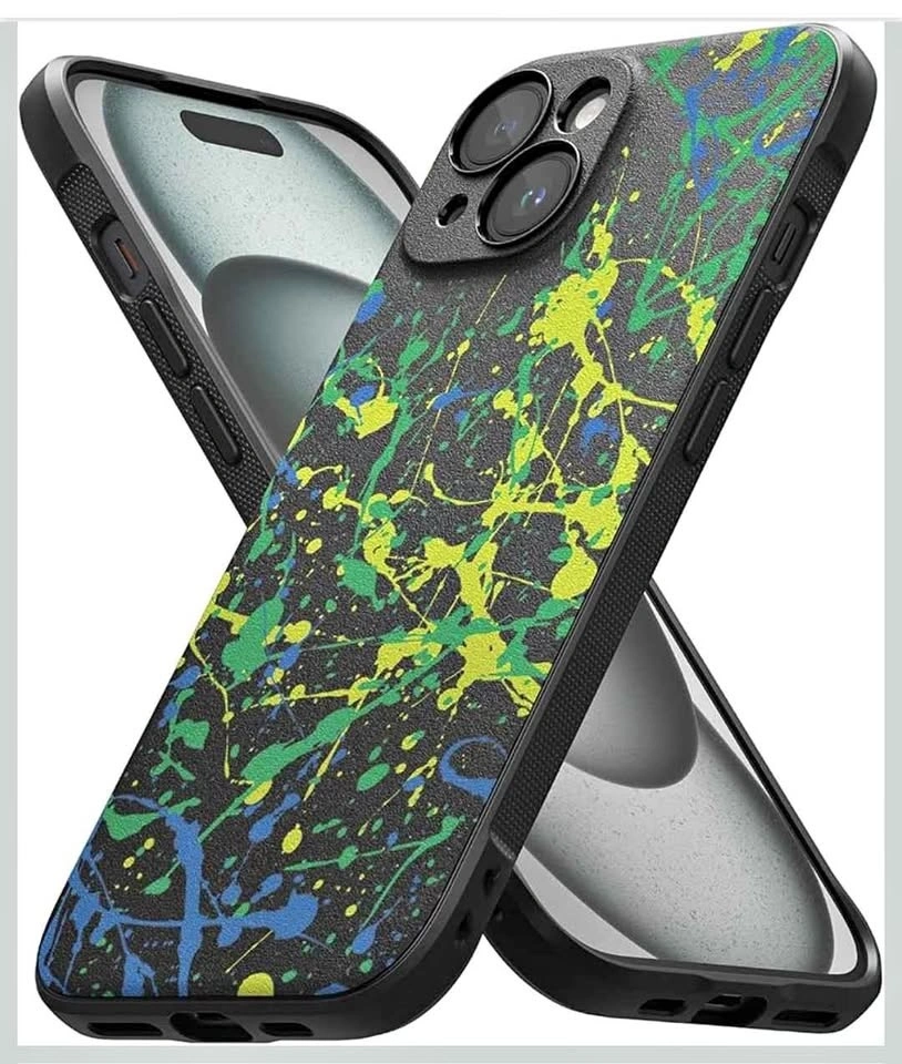 Ringke Onyx case for iPhone 15. Features anti-fingerprint technology, non-slip enhanced grip, and is smudge-proof. Feels good in the hand. Action Painting design.