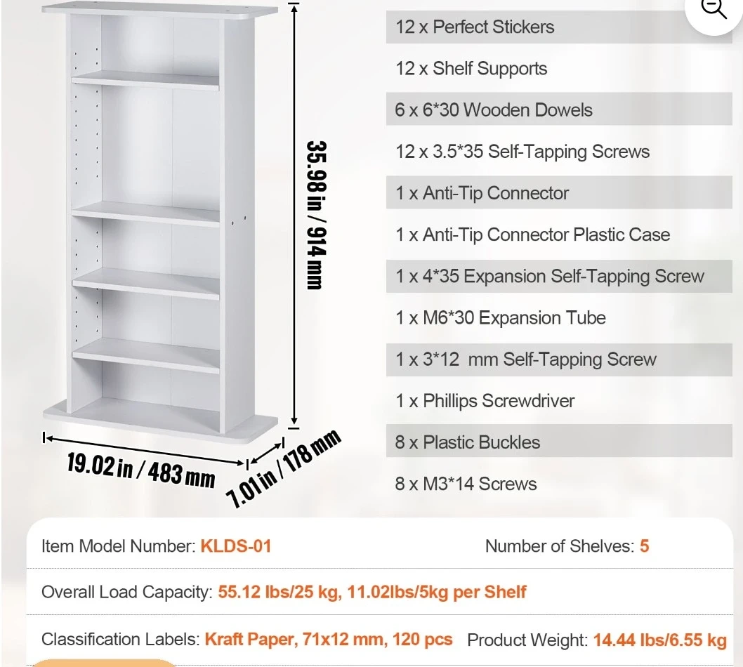 This white media storage tower has 5 shelves. It's made of particle board. Dimensions are 35.98" H x 19.02" W x 7.01" D./6 available. Can deliver same day for extra charge. Beautiful organization shelves. Can assemble for an extra charge.