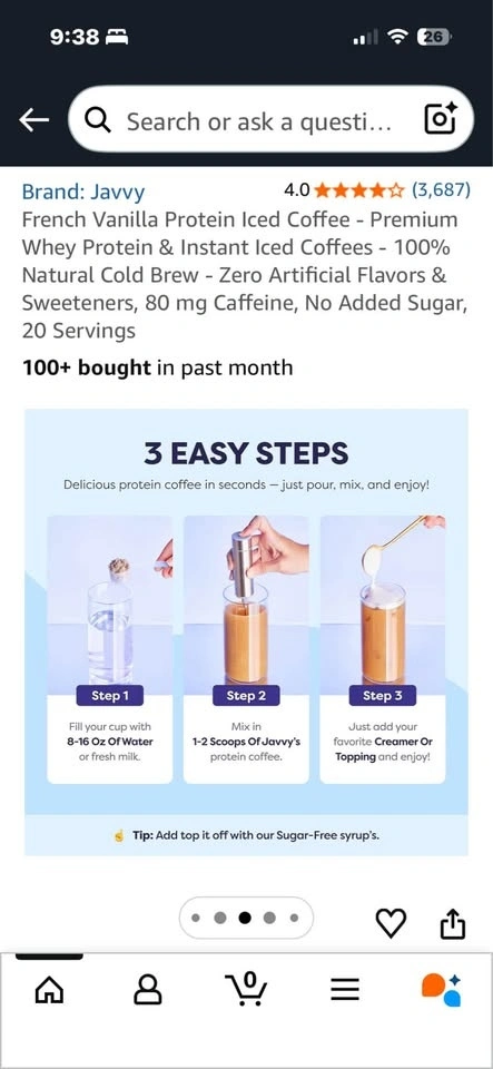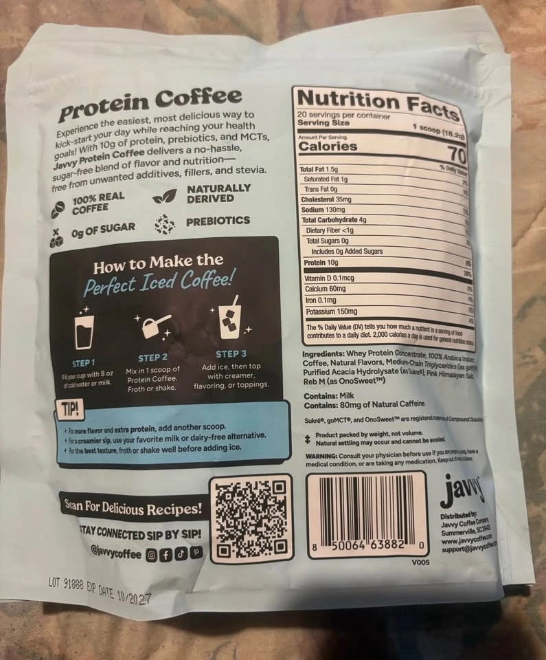 New Javy Protein Coffee in French Vanilla flavor. This is a 12.8oz bag, has 10g protein per scoop and 0g sugar. Super easy to make, just mix for instant iced coffee! Great for a quick boost, got real coffee, whey protein, MCTs, and prebiotics. Exp date is 10/2027. Pickup only. SE Vancouver Victoria & 61 ave.
