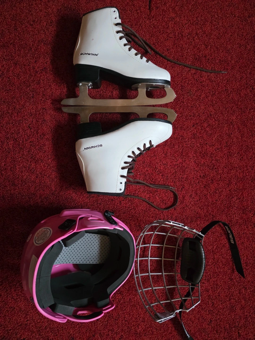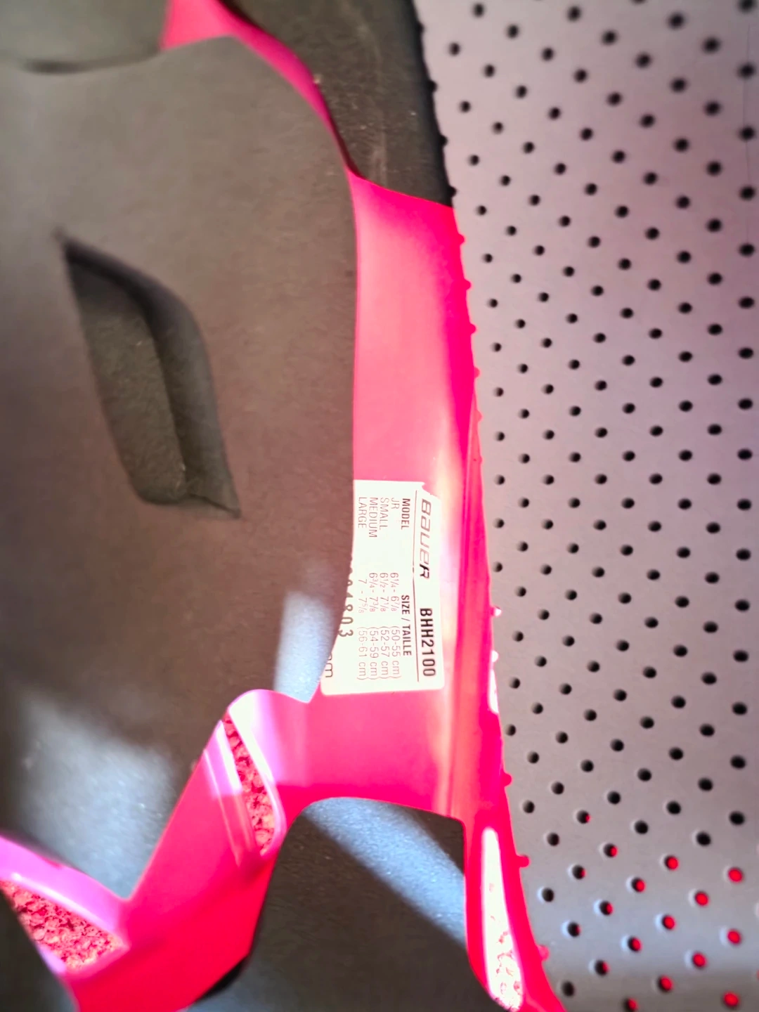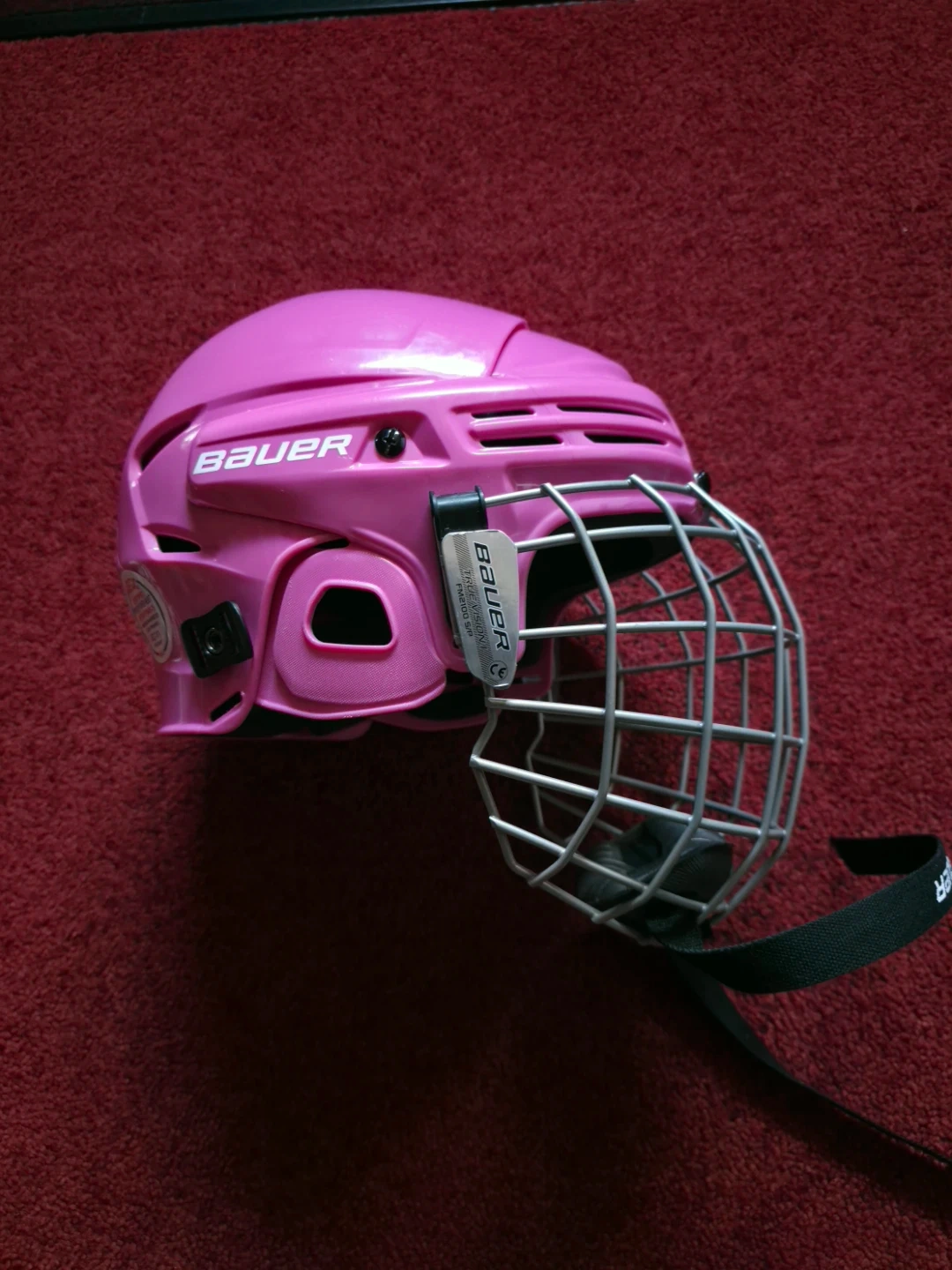 This is a pink Bauer hockey helmet, complete with a protective face cage. It's designed for safety on the ice. It's suitable for players who need a reliable helmet for the game.