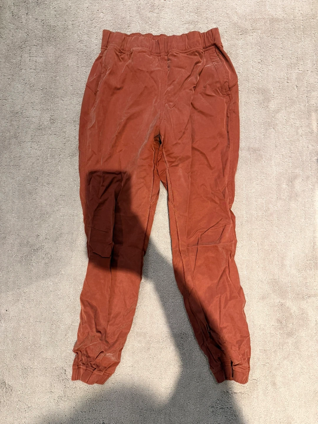 These are comfy jogger pants in a burnt orange colour. They've got an elastic waistband and cuffed ankles. Made from a soft fabric, they're great for casual wear. Adapt lululemon size 6 joggers.