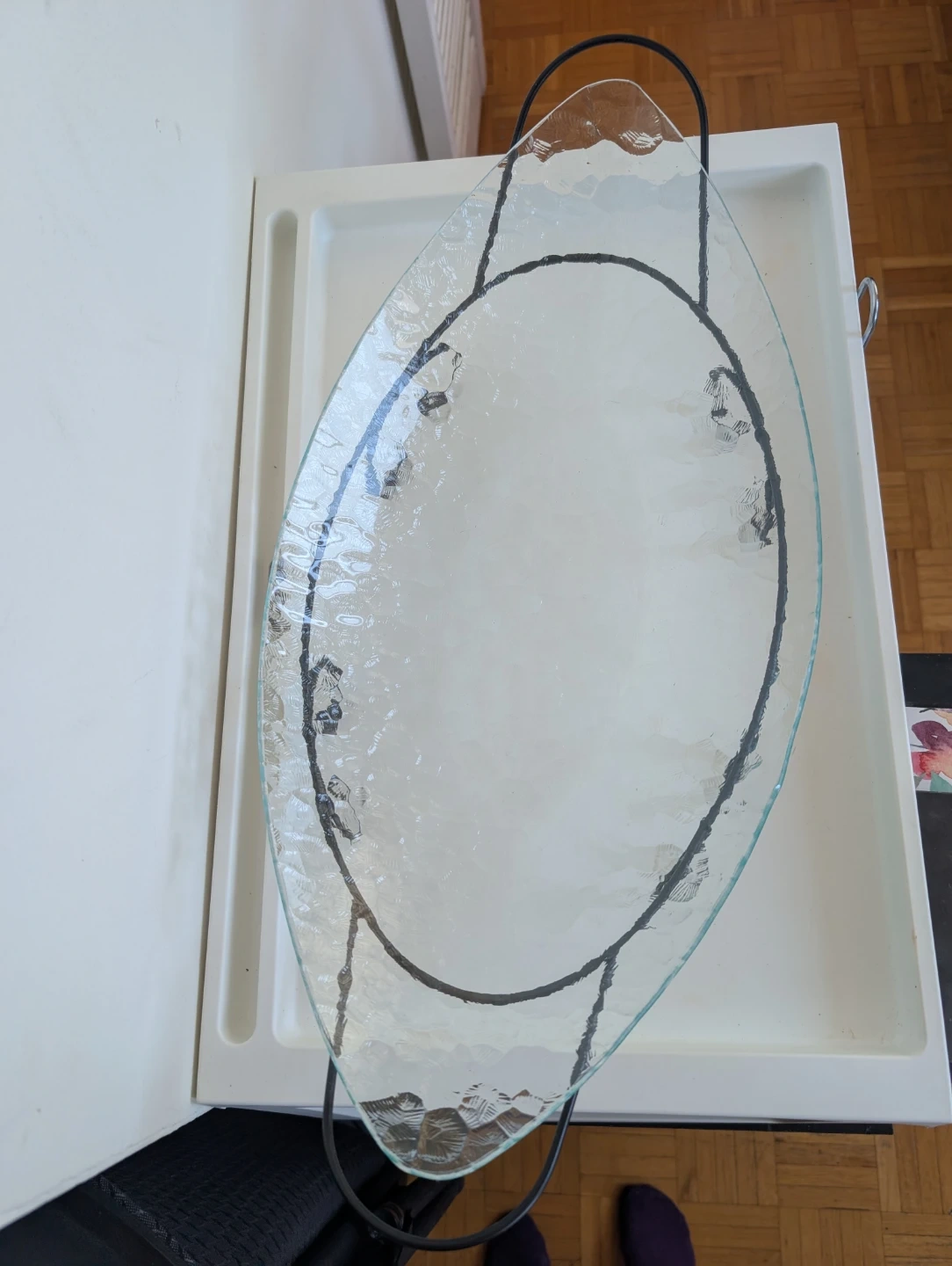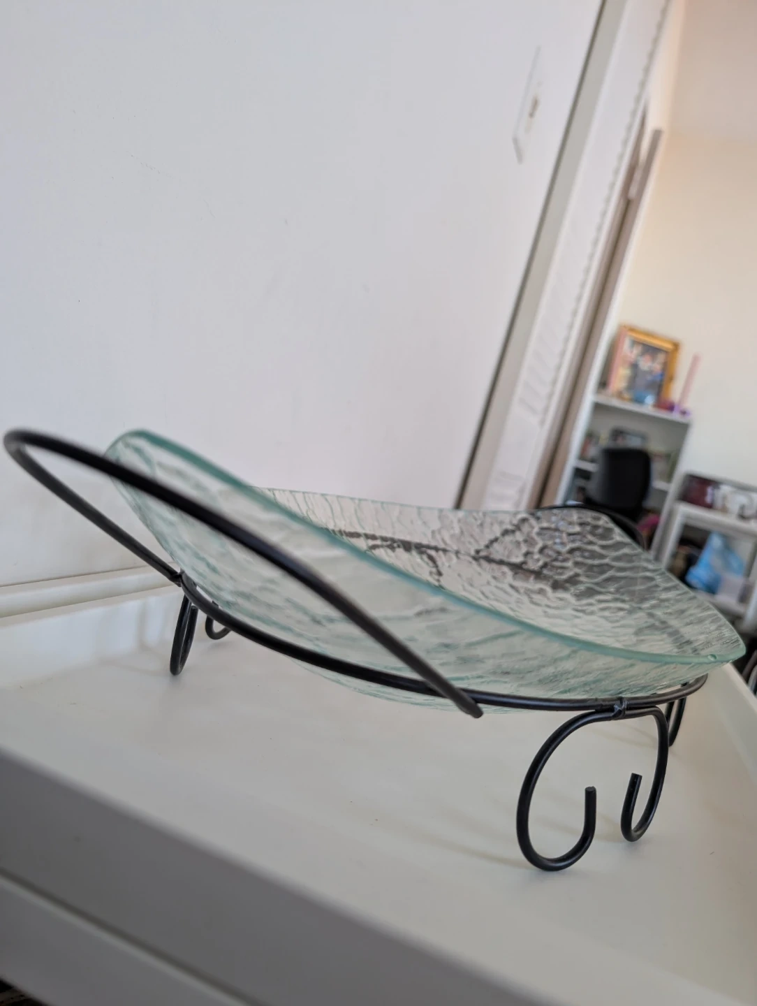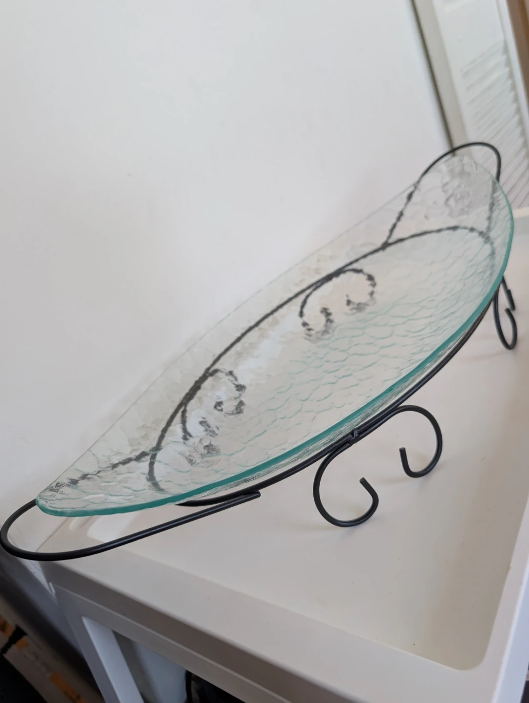 Clear textured glass oval serving tray with a black metal stand. It's approximately 15 inches long and 5.5 inches wide. The tray's textured surface adds a decorative touch. Great for serving snacks, fruit , meet or as a decorative centrepiece!
