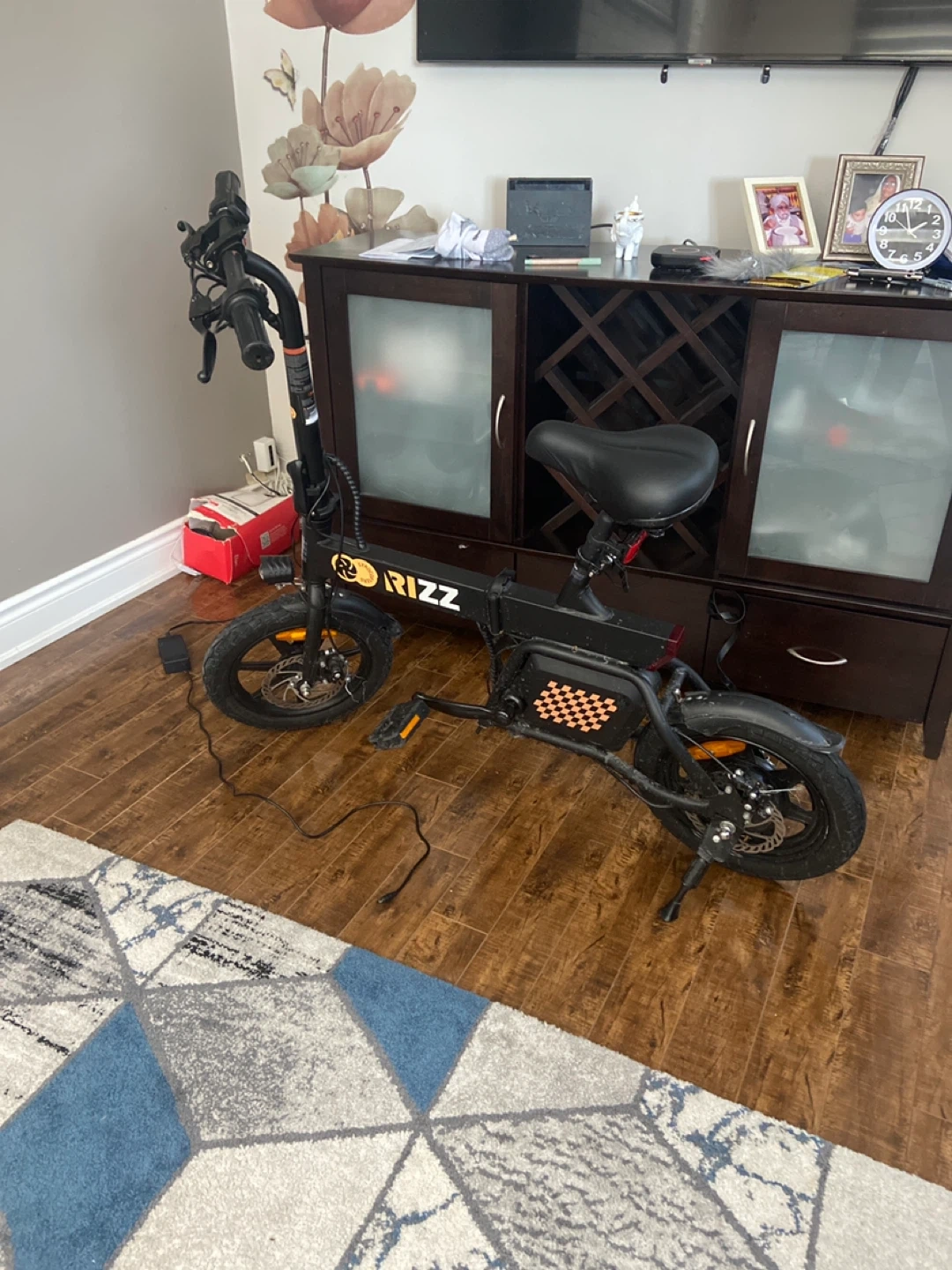 This is a RIZZ brand electric folding bike. It comes with its charger. It's great for getting around town!