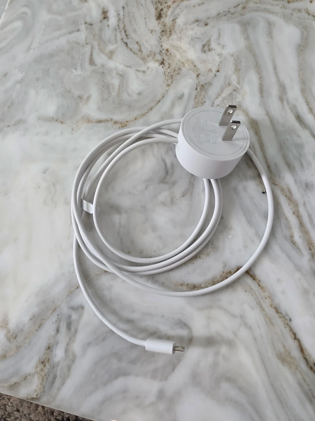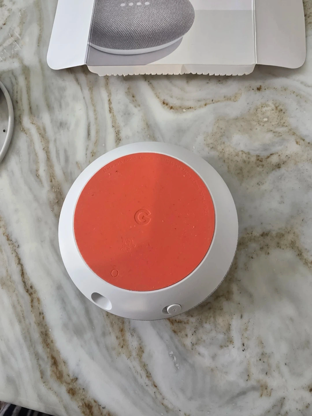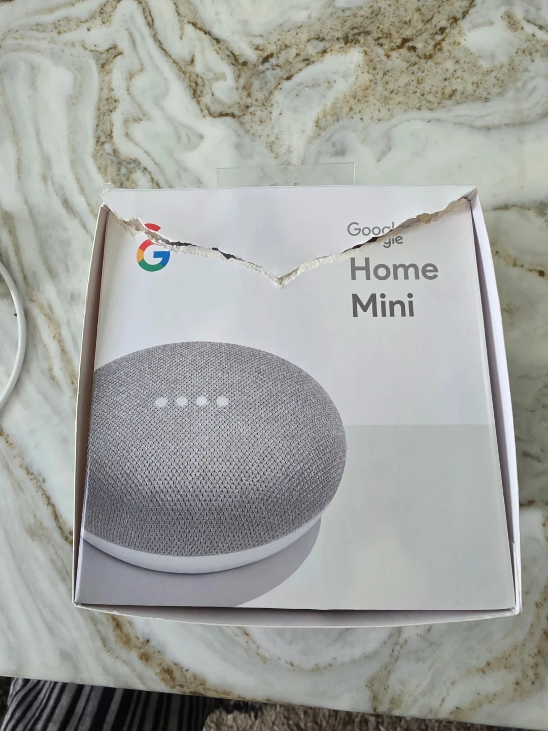 This is a Google Home Mini smart speaker in Chalk. It's a compact device that connects to your Wi-Fi network. It comes with an AC power adapter and cable. MFG: 03/2019.