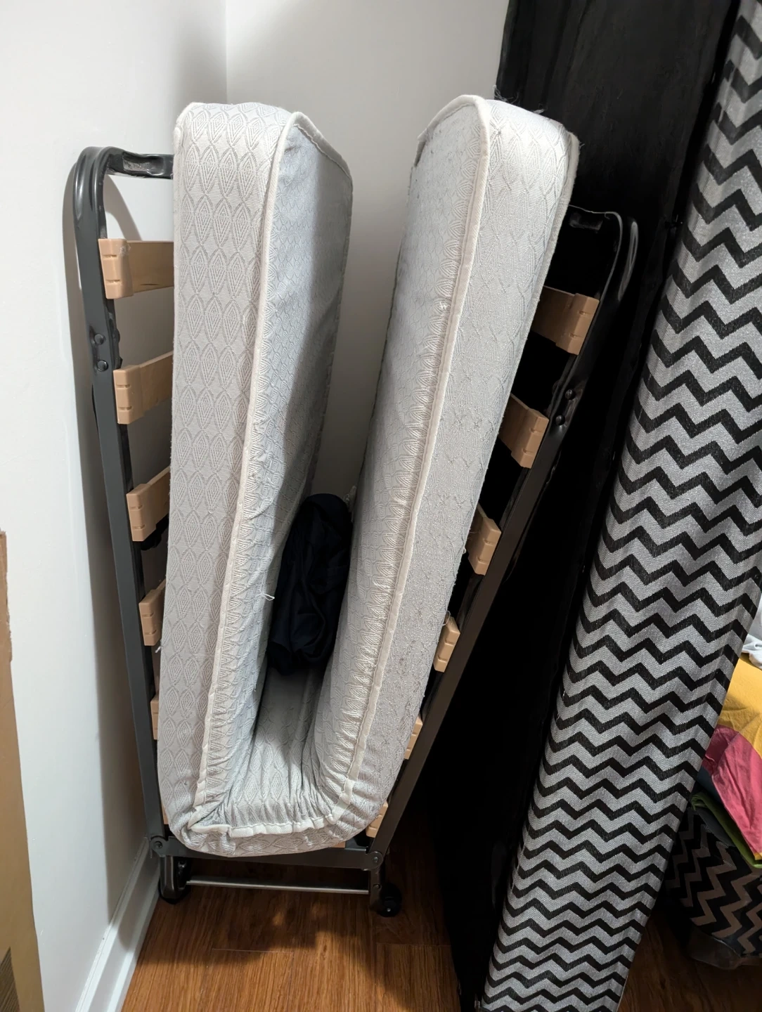 This is a folding bed with a comfortable mattress. It folds up for easy storage and has wheels for mobility. Perfect for guests, small spaces and comfortable