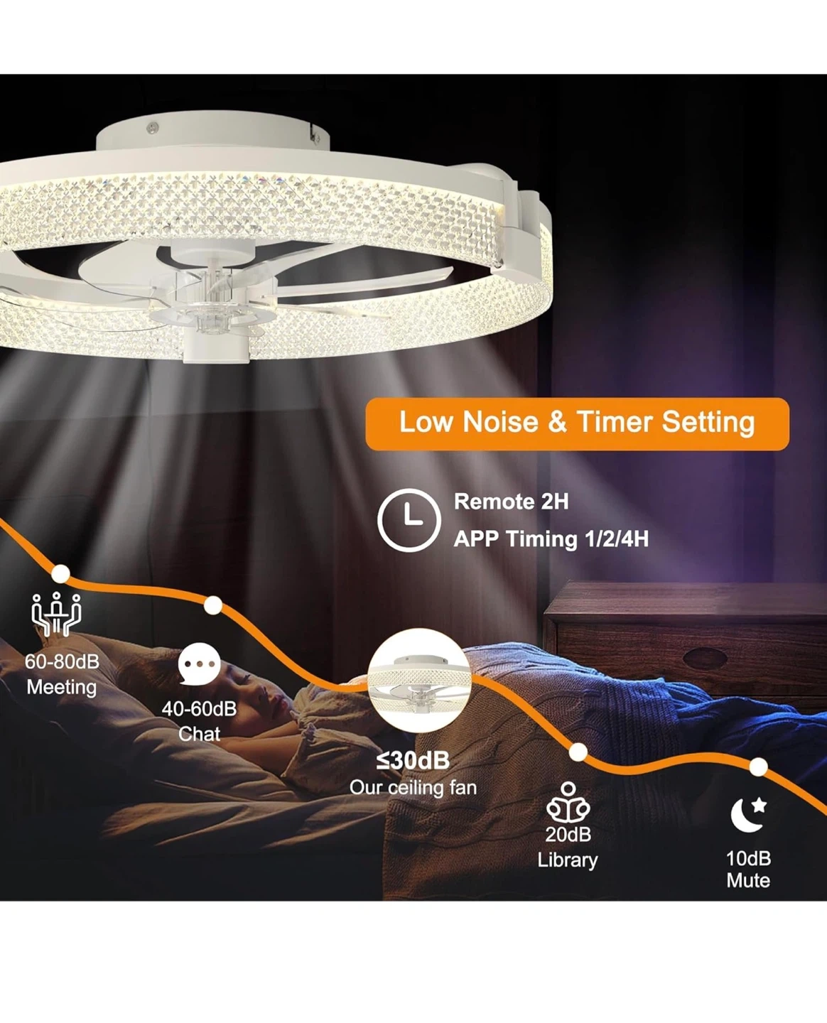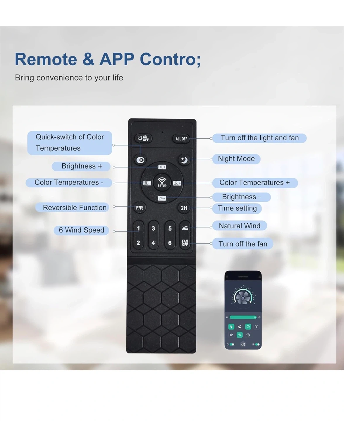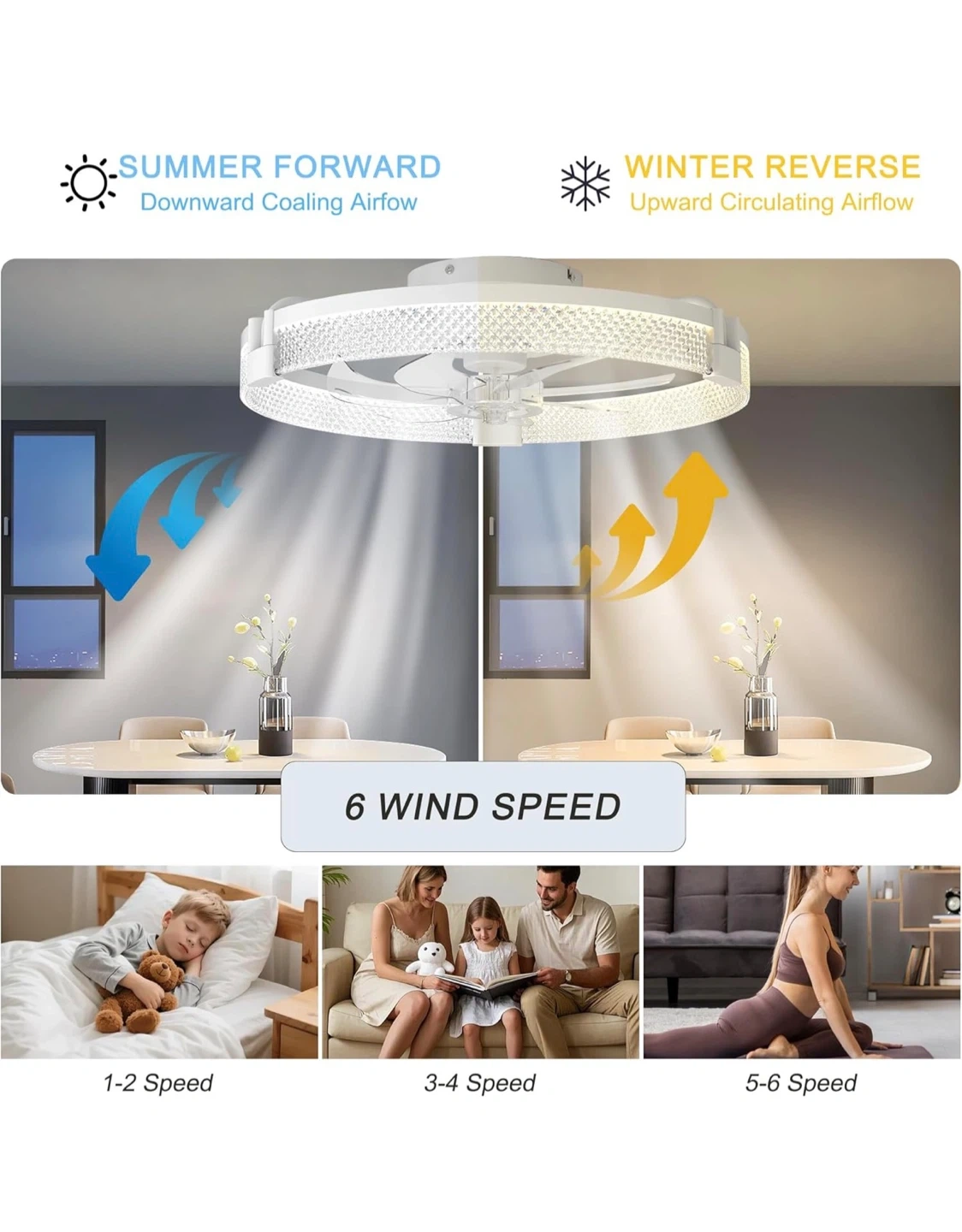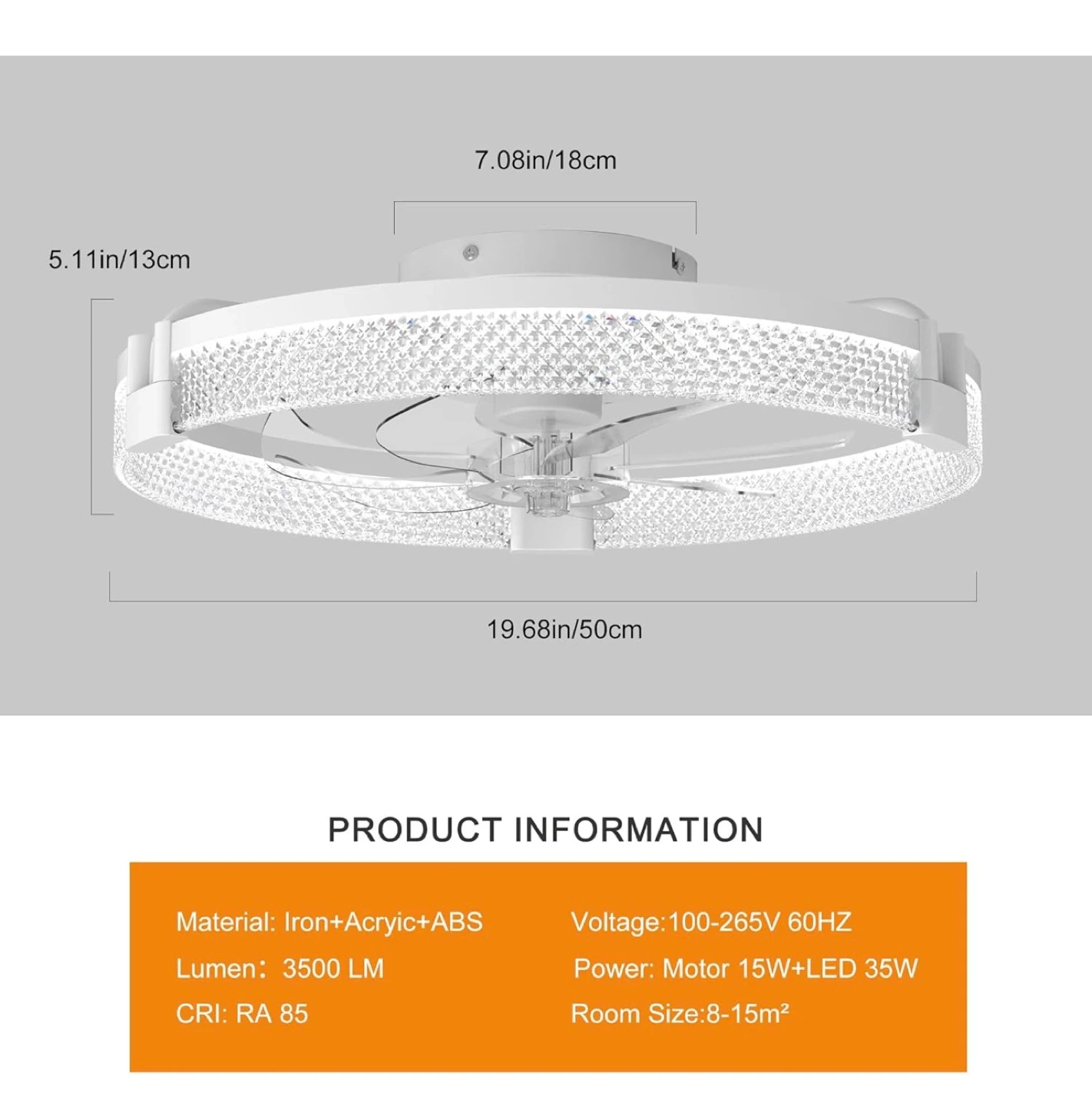 This ceiling fan features a 19.7-inch diameter with integrated dimmable LED lights. It's equipped with a DC motor and offers 6 wind speeds, with summer forward and winter reverse airflow options. Includes remote control for color temperature adjustment (3000K-6000K) and brightness control (10%-100%). Material: Iron+Acrylic+ABS. Room size: 8-15m².