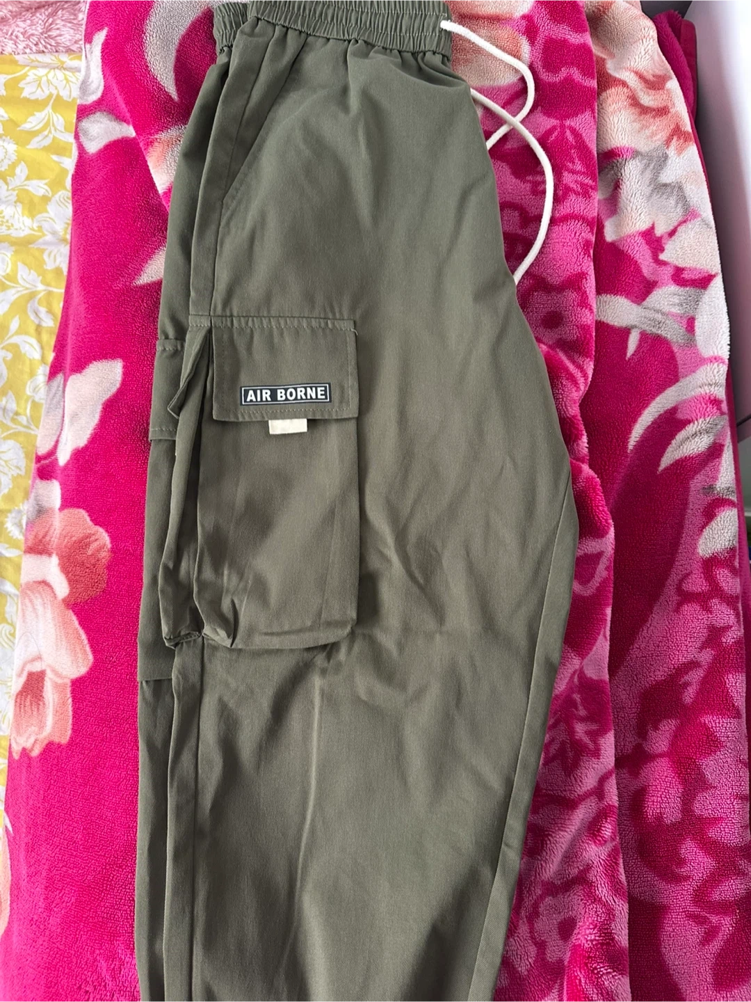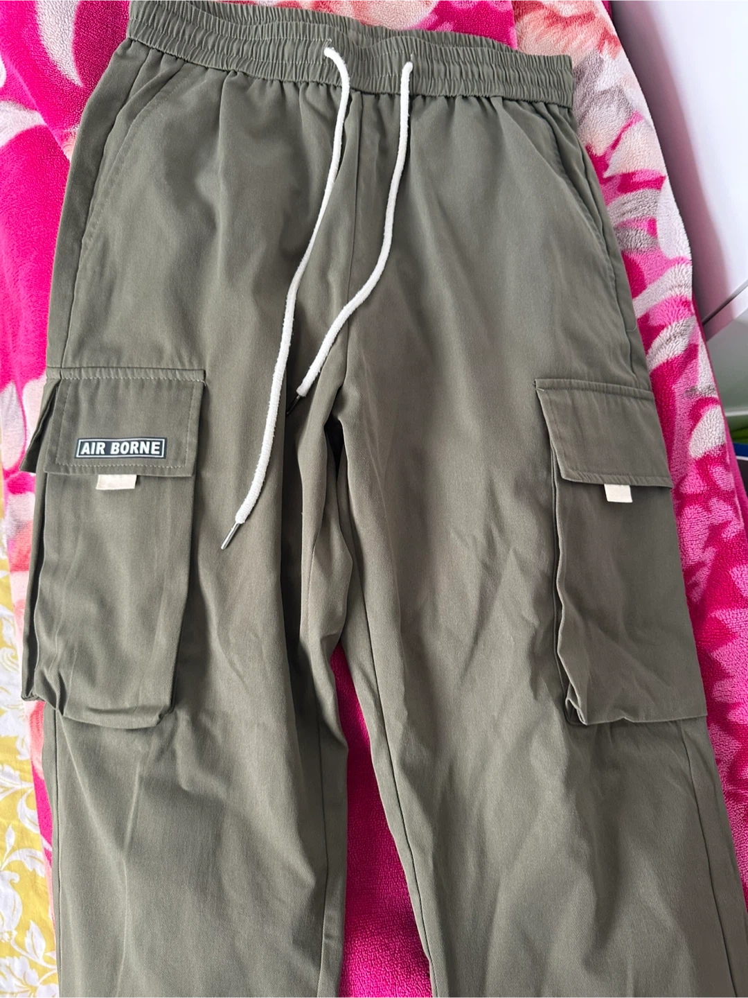 Comfy olive green cargo joggers. Has elastic waistband with white drawstring. Side pockets and cargo pockets on the legs. Ribbed cuffs too.