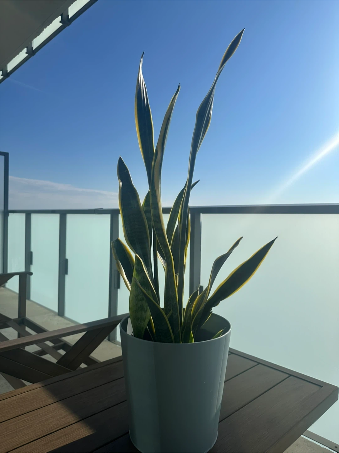 A healthy Snake Plant in a grey pot. It's a low-maintenance houseplant known for its air-purifying qualities. Perfect for adding a touch of green to any indoor space!