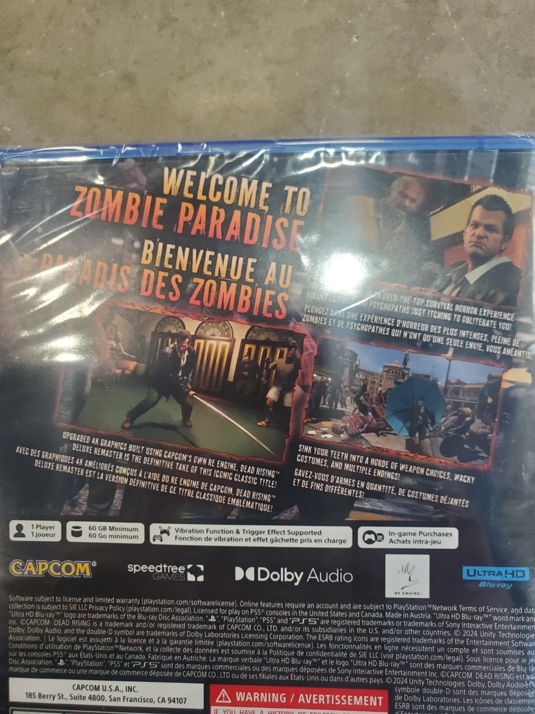 The Deluxe Remaster version of Dead Rising for PlayStation 5 is here! It includes upgraded 4K graphics and all DLC. This is the definitive take on the iconic classic title, offering a thrilling survival horror experience. It's rated Mature 17+.