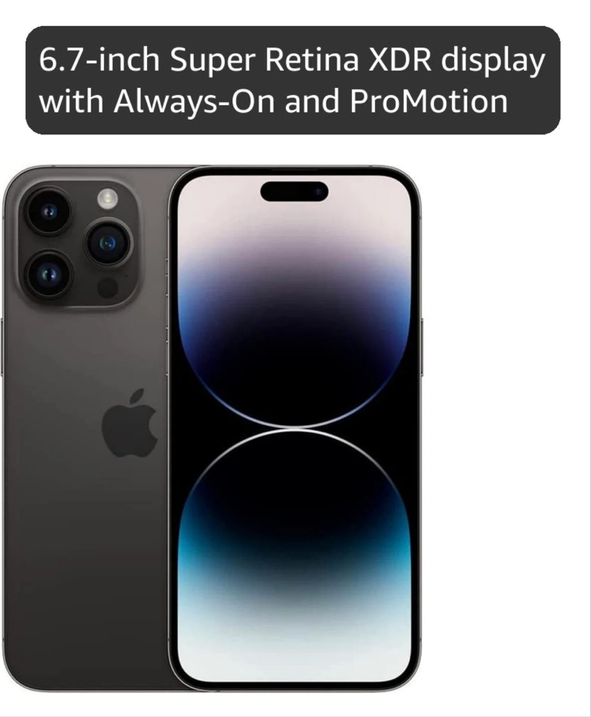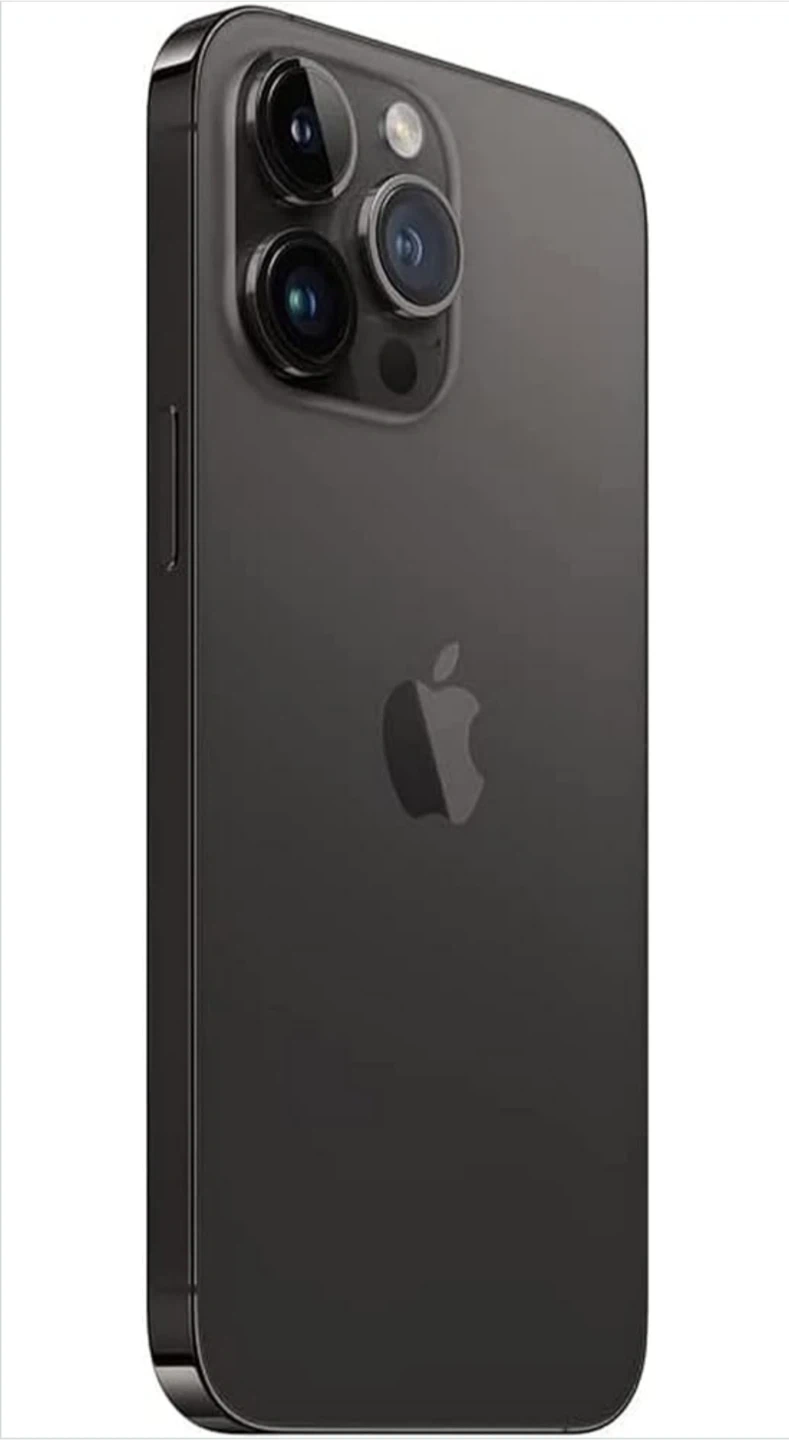Apple iPhone 14 Pro Max in Space Black. It features a 6.7-inch Super Retina XDR display with Always-On and ProMotion. This phone has a powerful A16 Bionic chip and a Pro camera system.