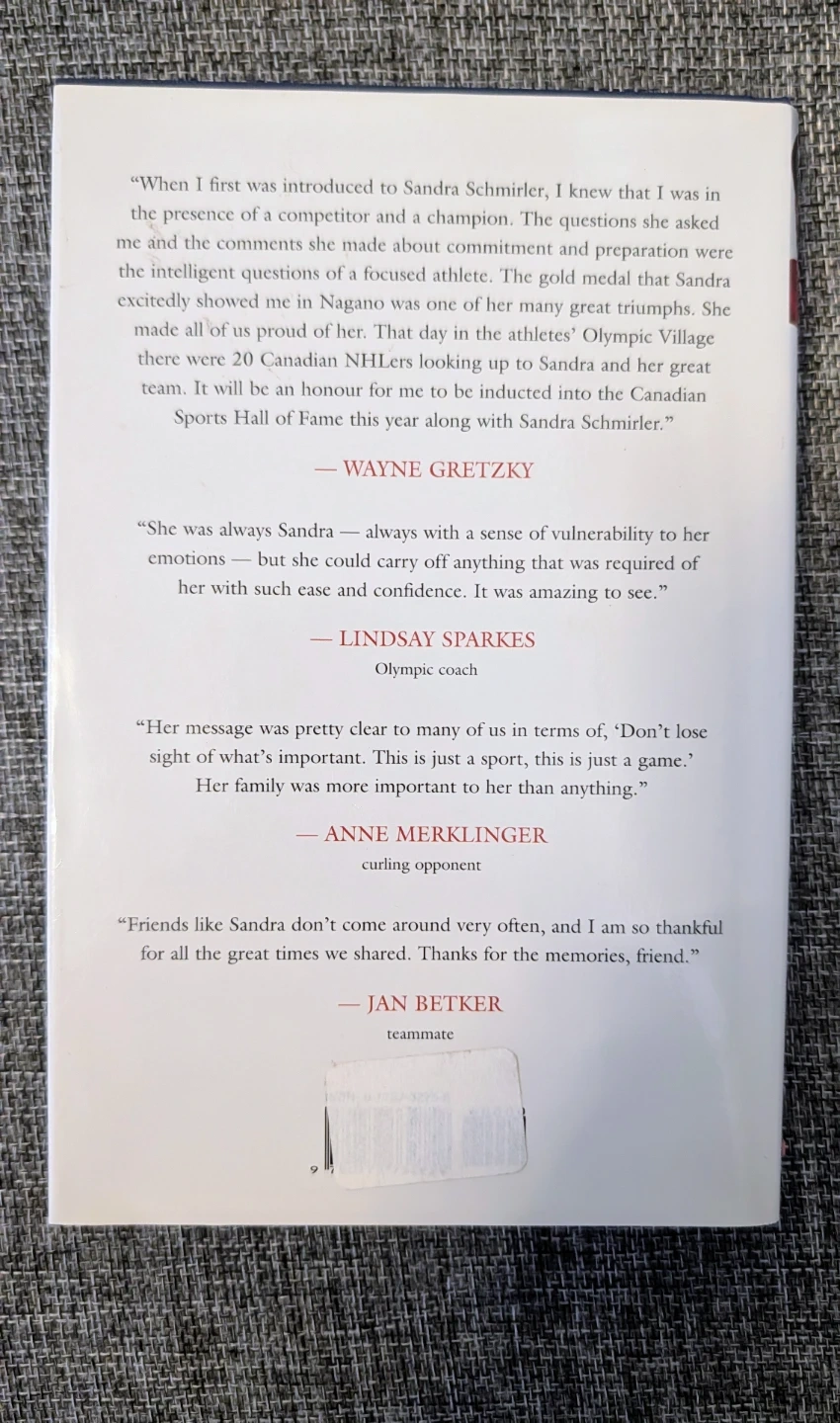 This is a biography about Sandra Schmirler, "The Queen of Curling." It was written by Perry Lefko. It details her life and achievements in curling.
