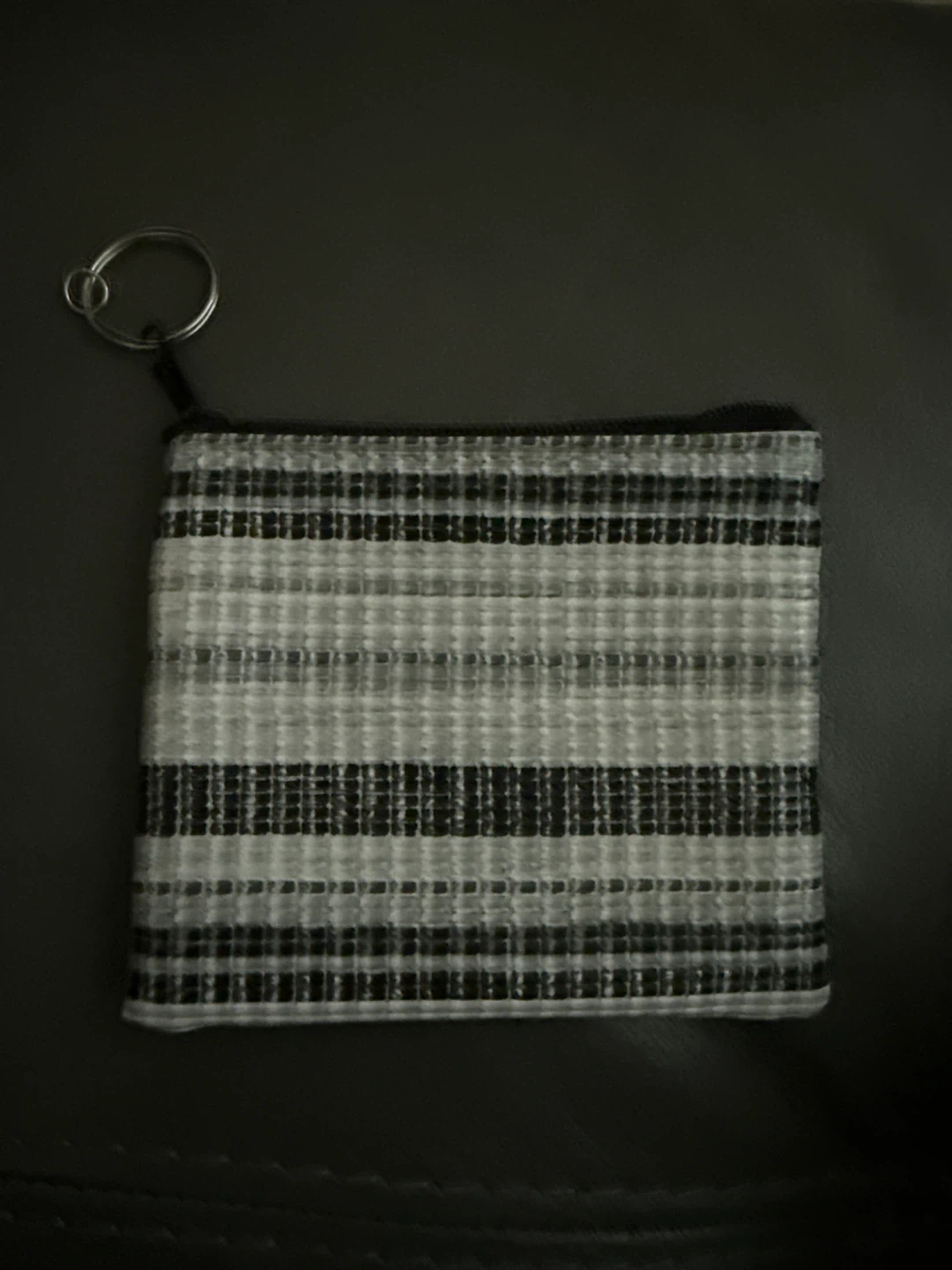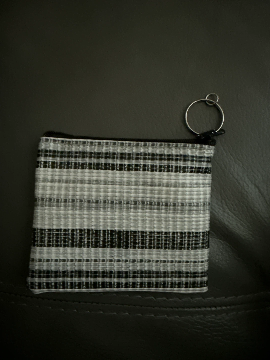 A small zippered pouch with a black and grey stripe pattern. It's made of woven fabric and includes a metal keyring. Perfect for keeping coins or small essentials handy!