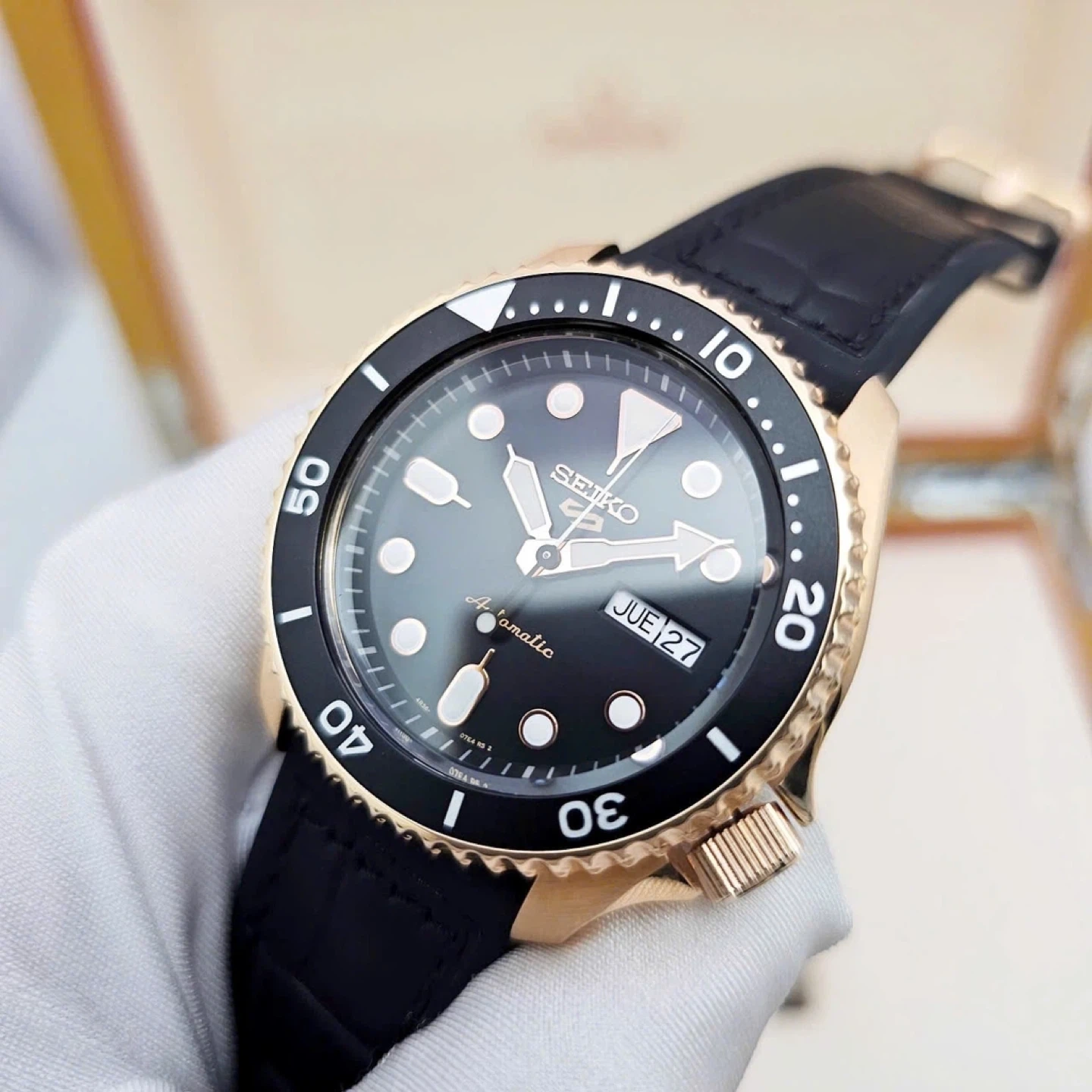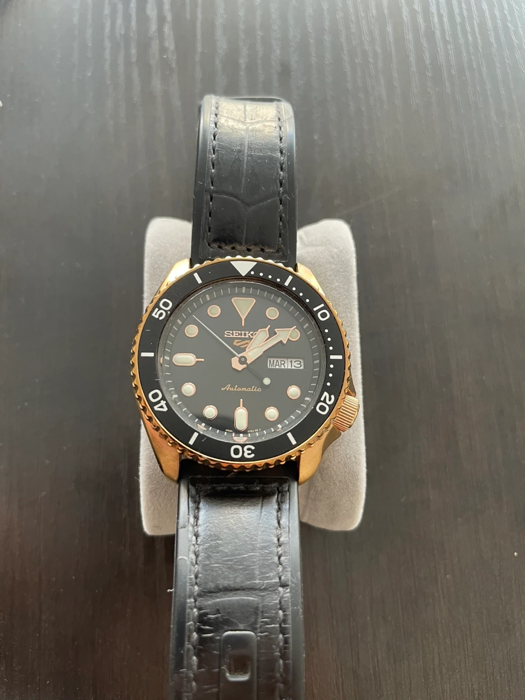 Classic Seiko 5 automatic watch with a black dial and rose gold-tone case. Features a date and day display. It has a black leather strap.