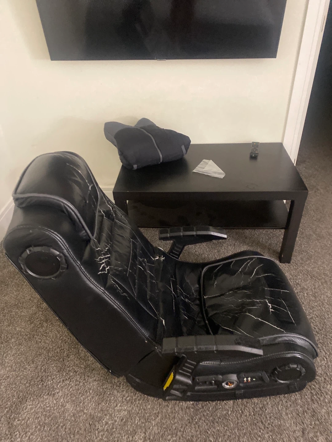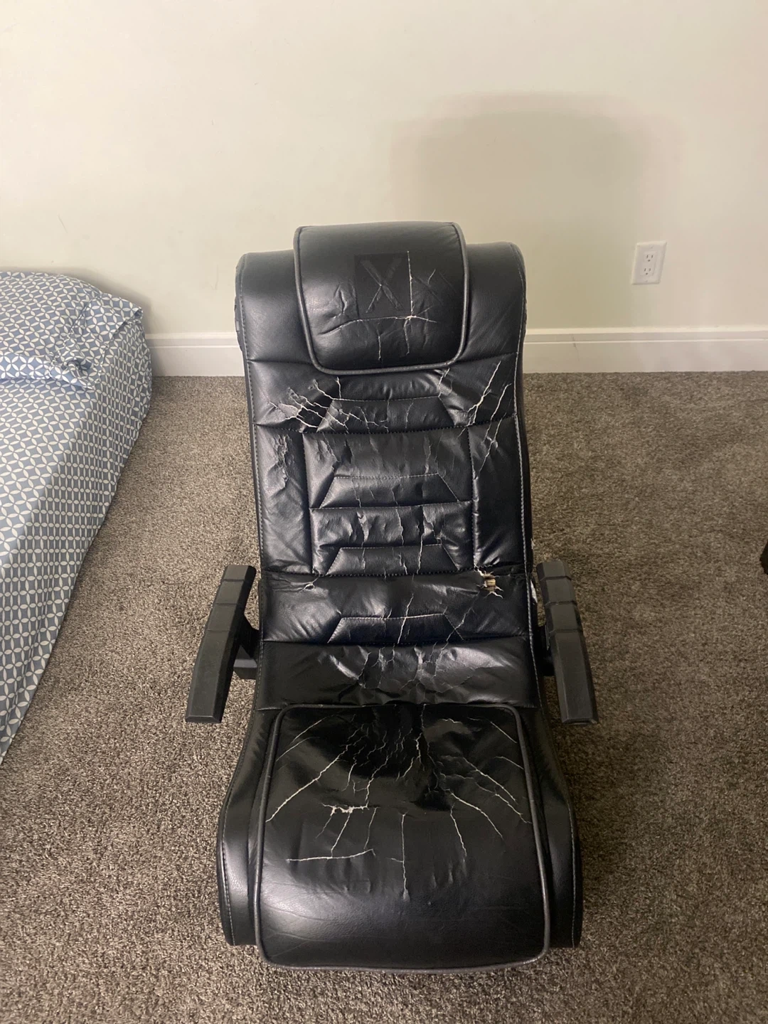 This black gaming chair has seen better days, as you can see from the wear and tear. It still functions, but the material is cracked. Great for someone looking for a budget option or a project!