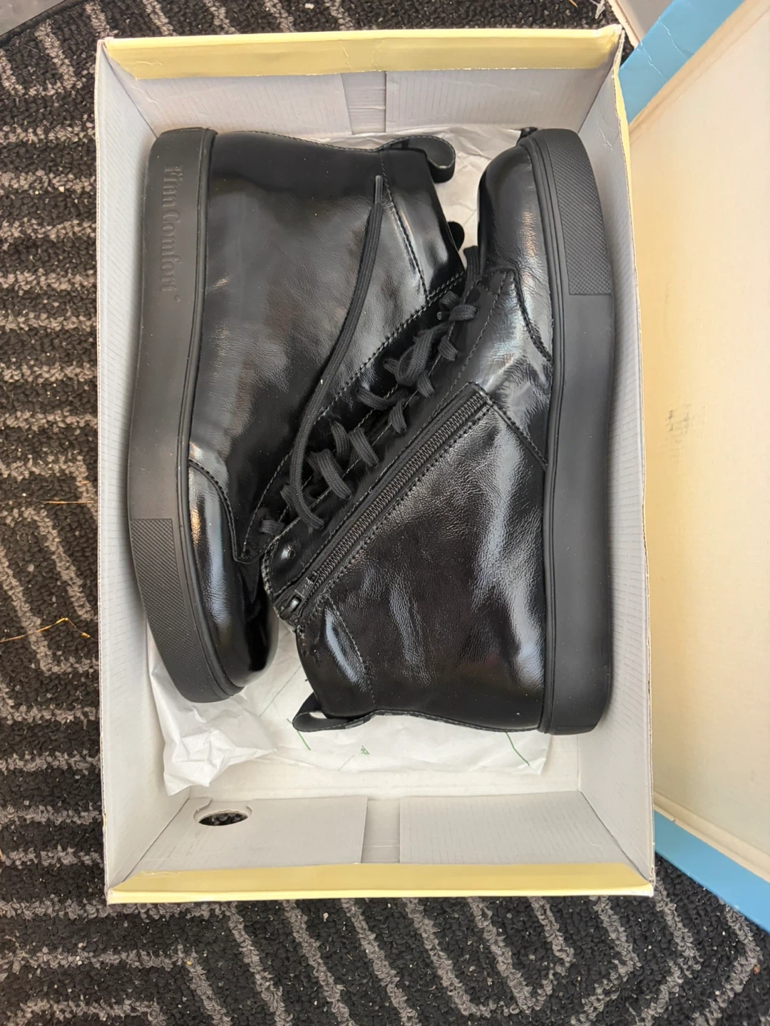 Finn Comfort Pisco high-top sneakers in black. Size UK 7 (US 9.5 Women's, EU 40.5). Features a side zipper and shock absorber sole. Made in Germany.