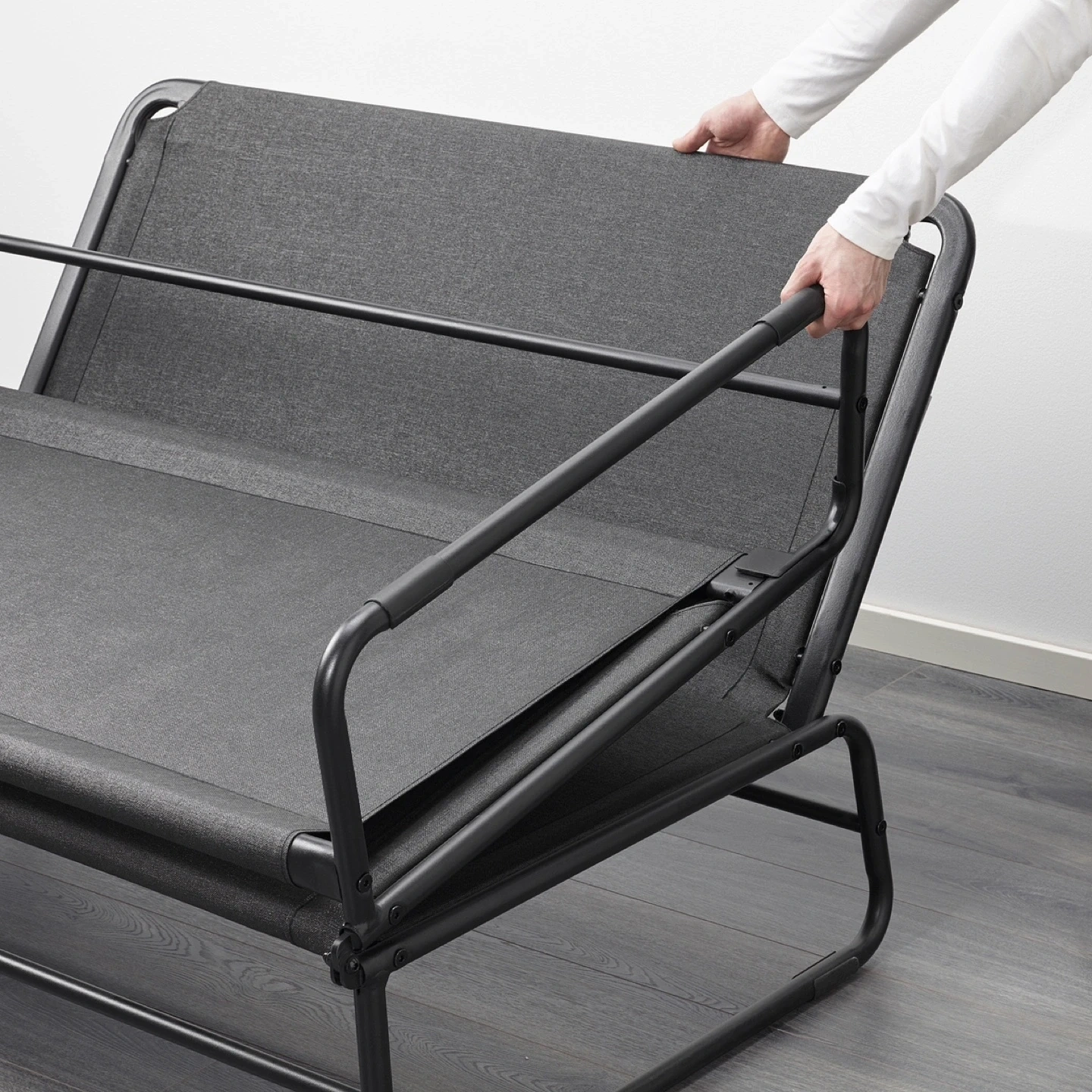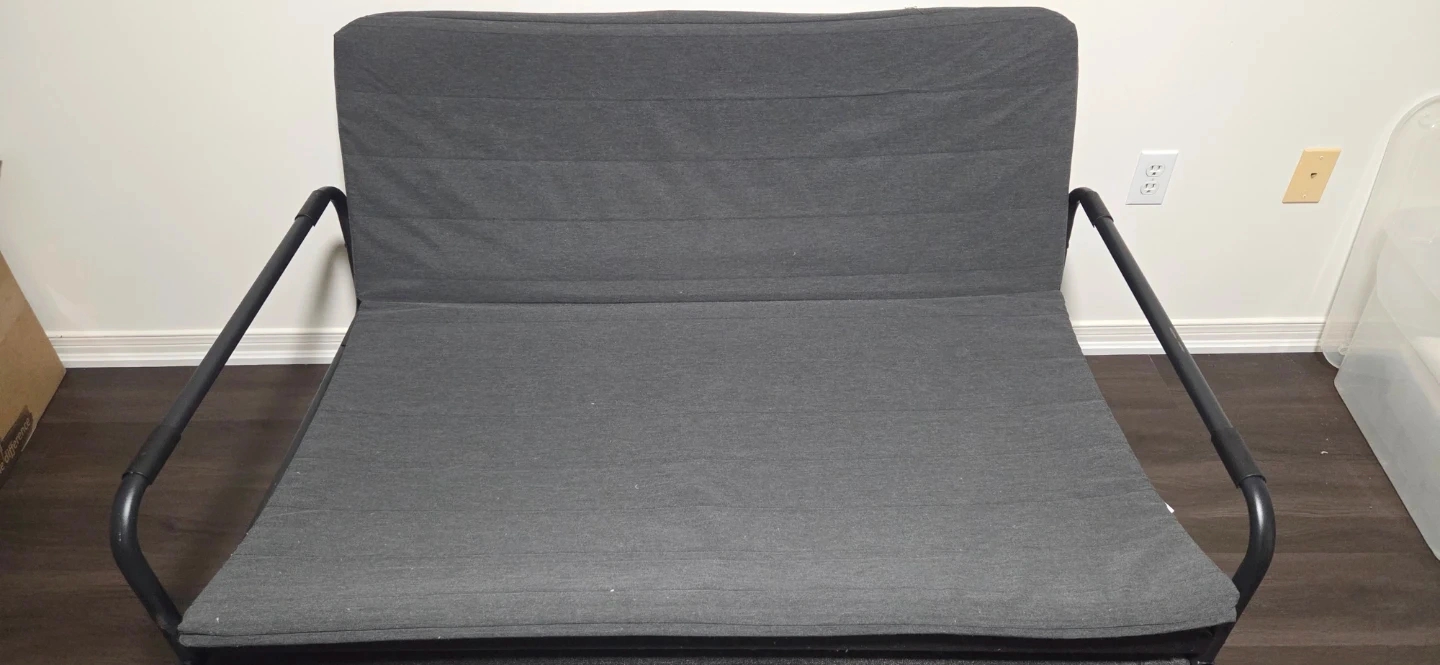 This is an IKEA Friheten sofa bed in grey. It's a versatile piece of furniture that easily converts from a sofa to a bed. The frame is made of metal and the upholstery is fabric.