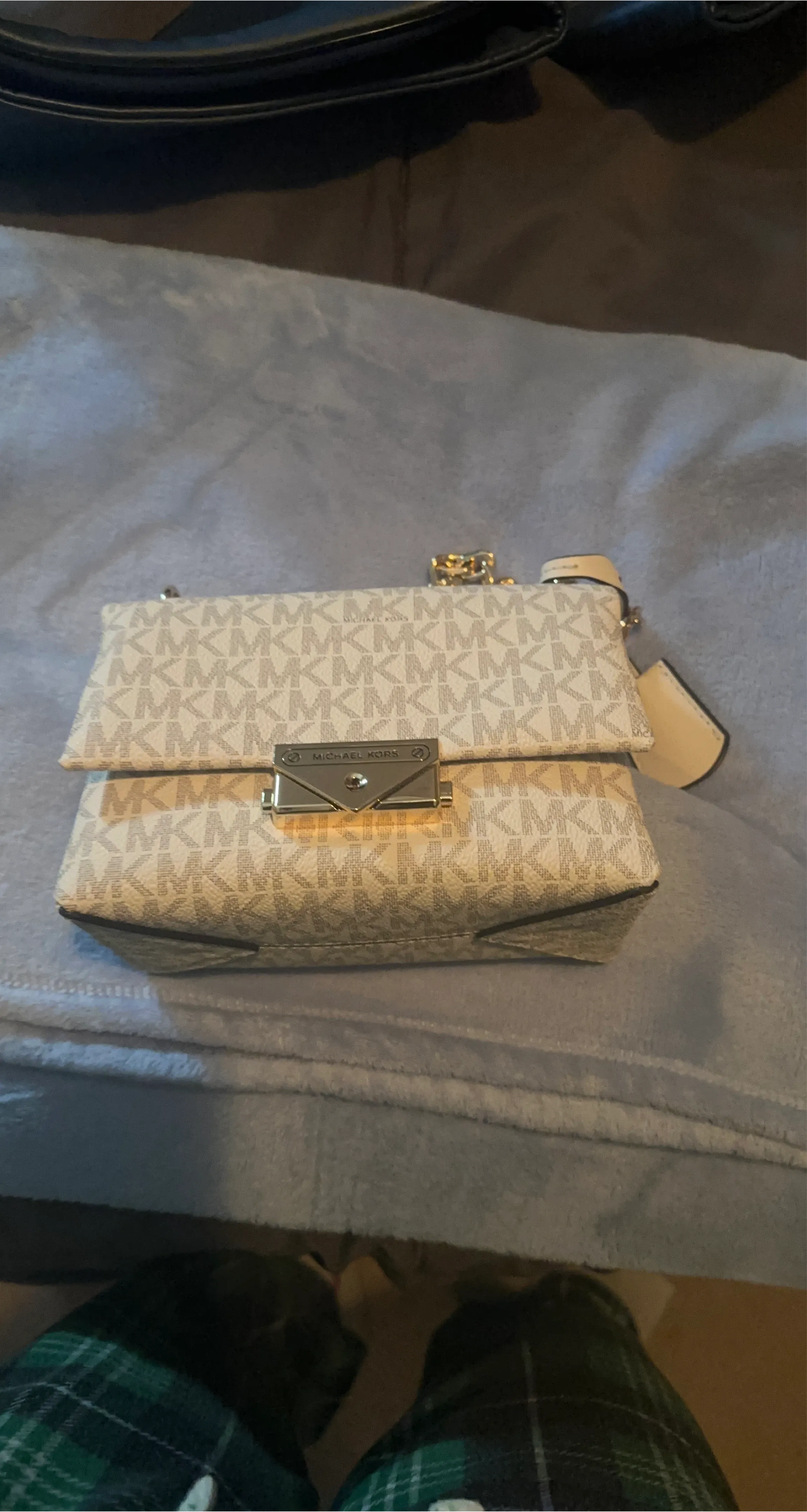 This is a Michael Kors shoulder bag featuring the classic MK signature print. It has a gold-tone hardware closure and a chic, structured design. It's a stylish accessory for everyday use.