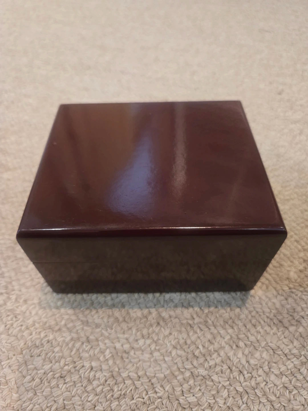 This is a dark brown, polished jewellery box. It's perfect for storing small trinkets or precious items. The interior is lined with a light-coloured fabric. Good for watches as well