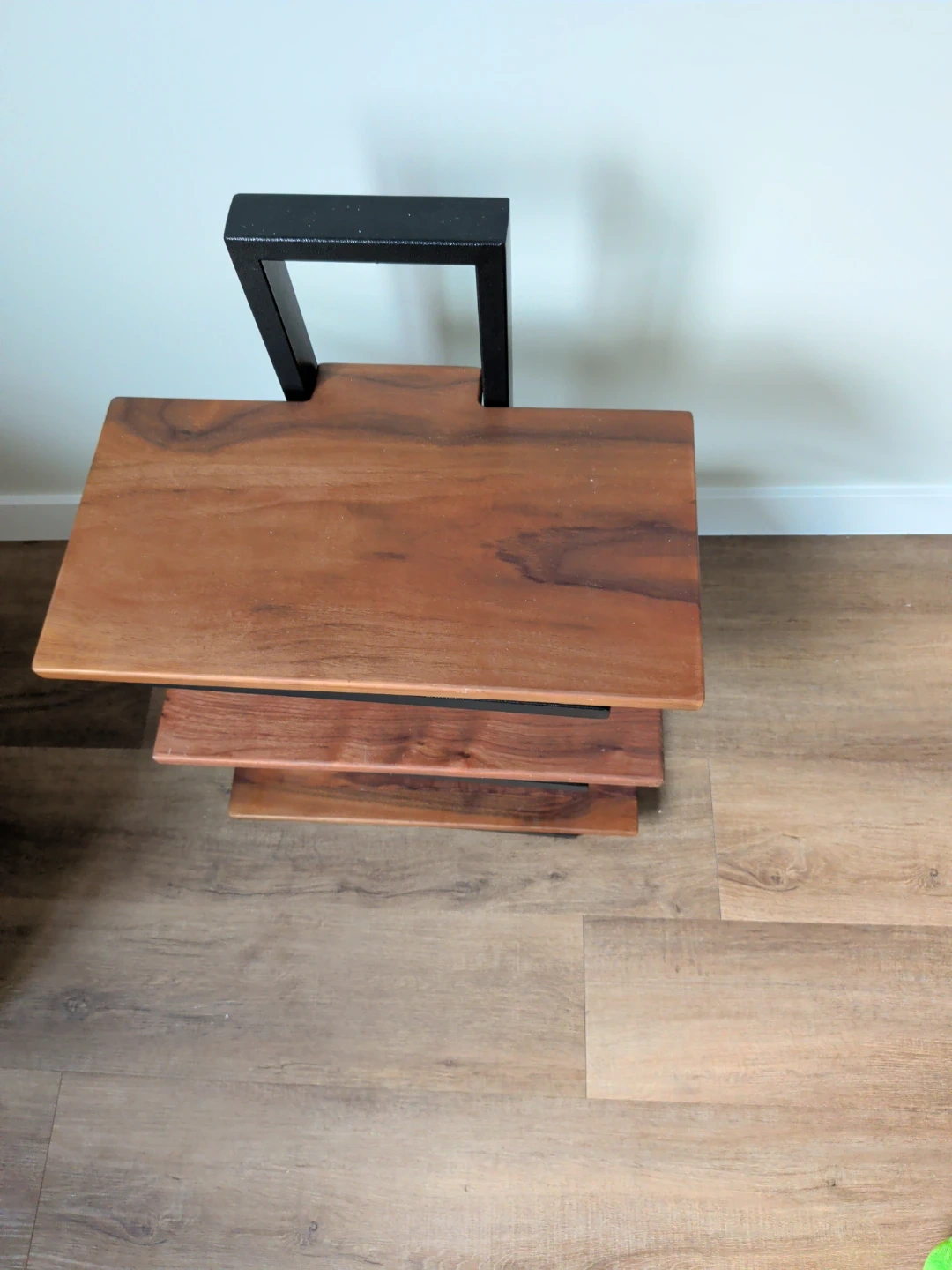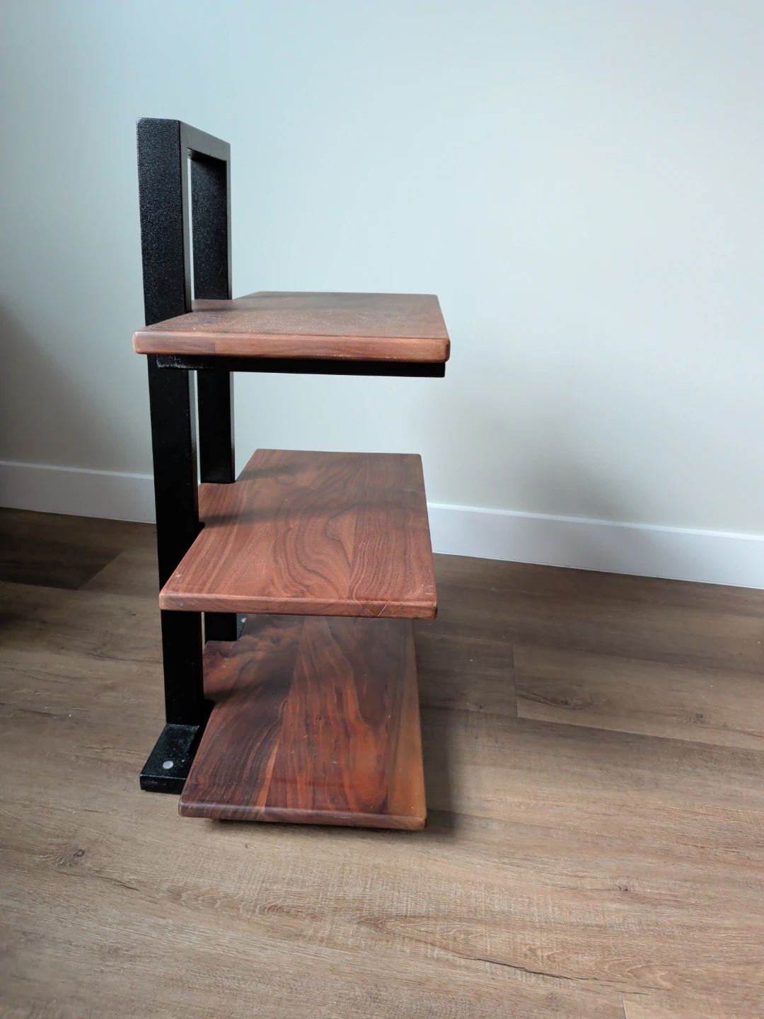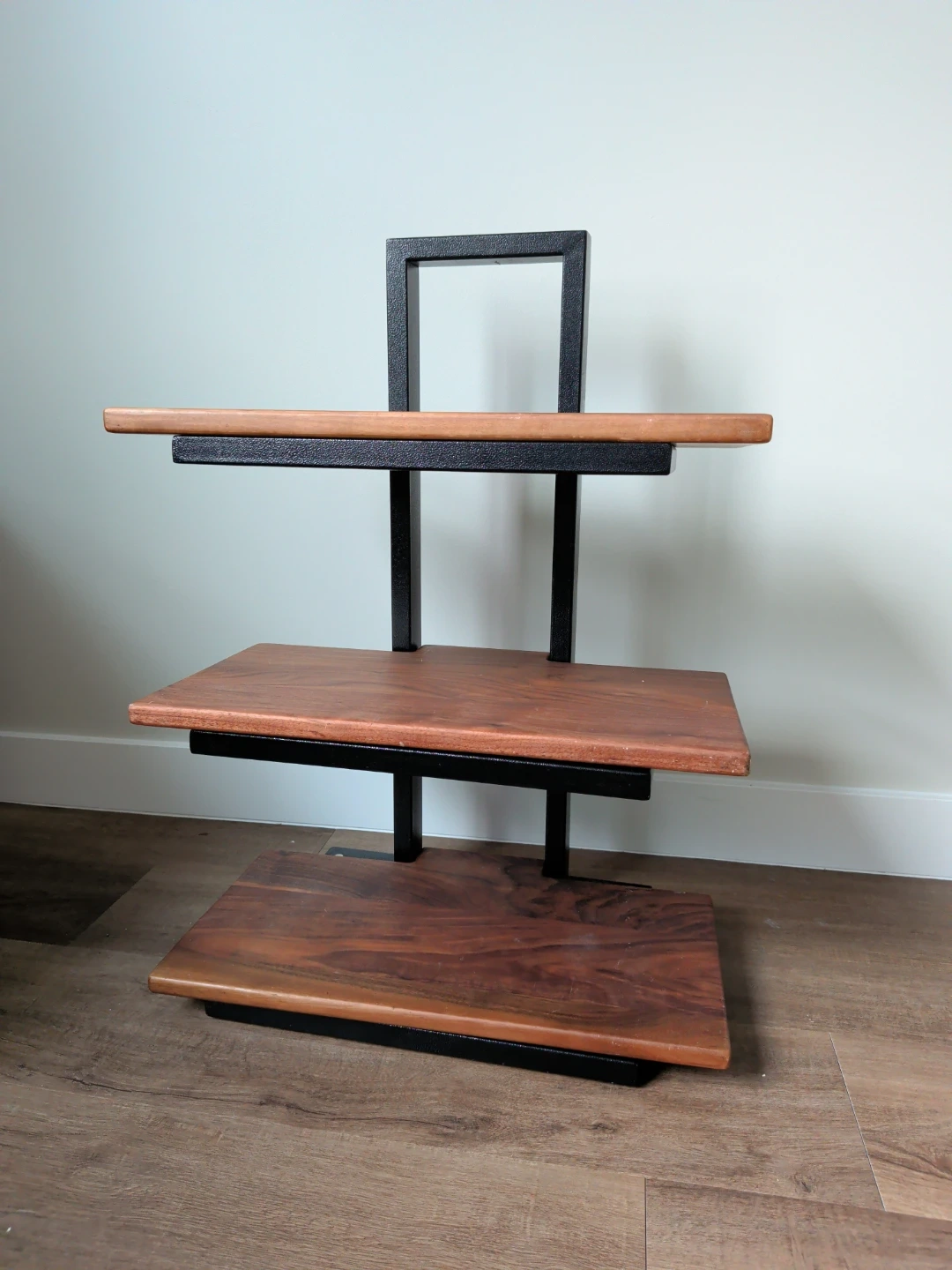 This shelf unit features three tiers with rich wood surfaces and a sturdy black metal frame. It's perfect for displaying electronics or decorative items.