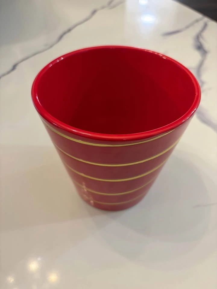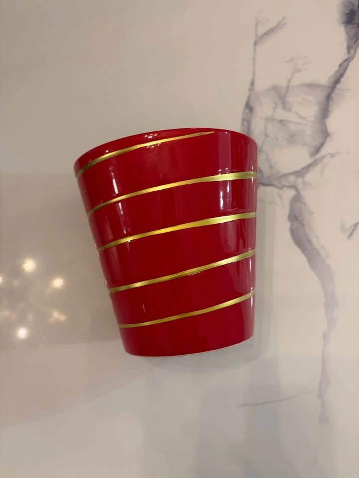 Festive red ceramic flower pot with elegant gold swirl detailing. Perfect for poinsettias, orchids, holiday greenery, or seasonal décor.