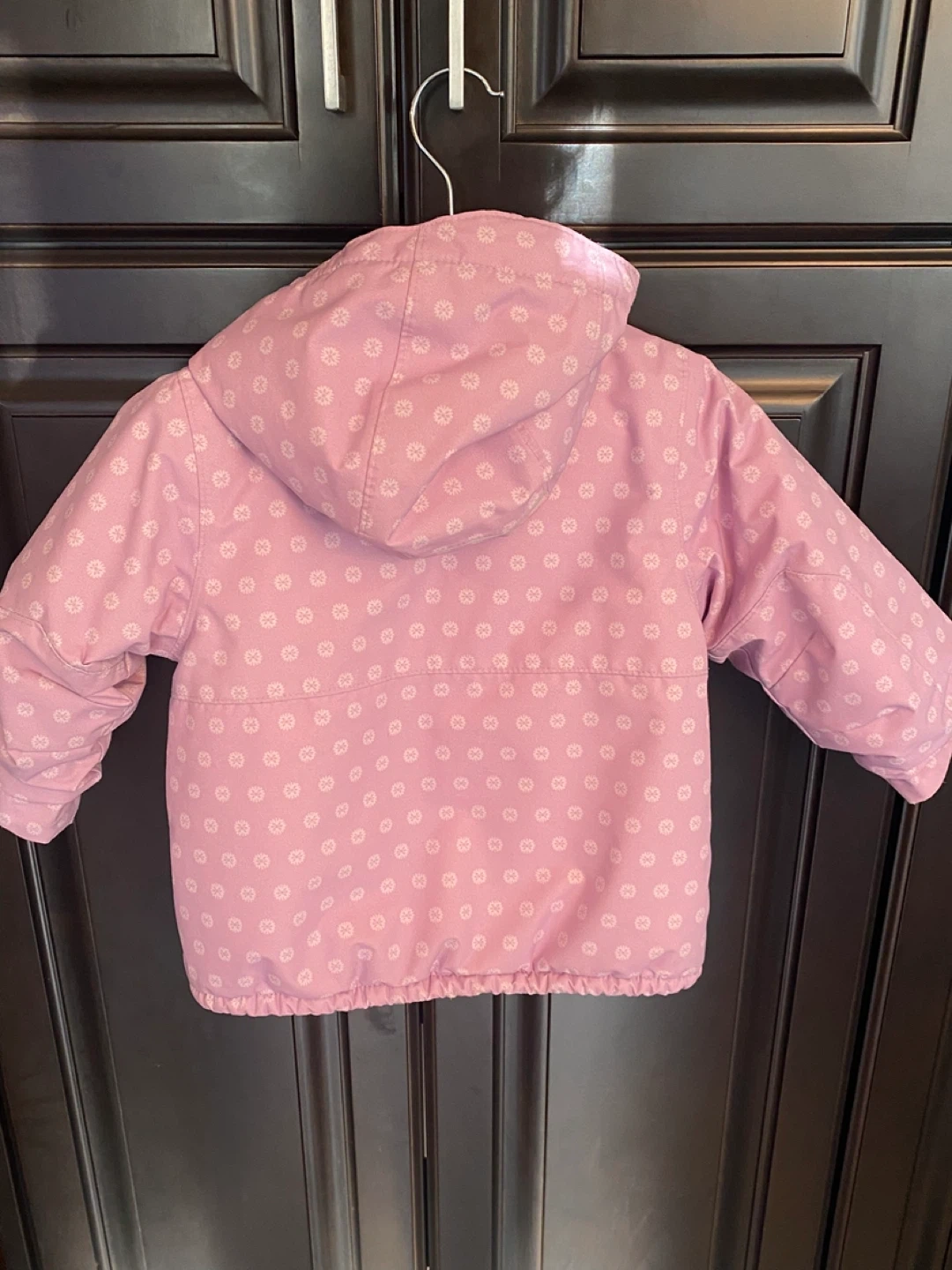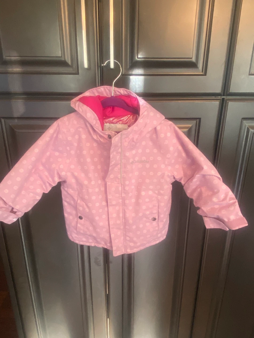 Columbia ski jacket for toddlers in a fun pink polka dot pattern. It features an "Out-Grow" system to extend the cuffs for longer wear. Smoke free home.