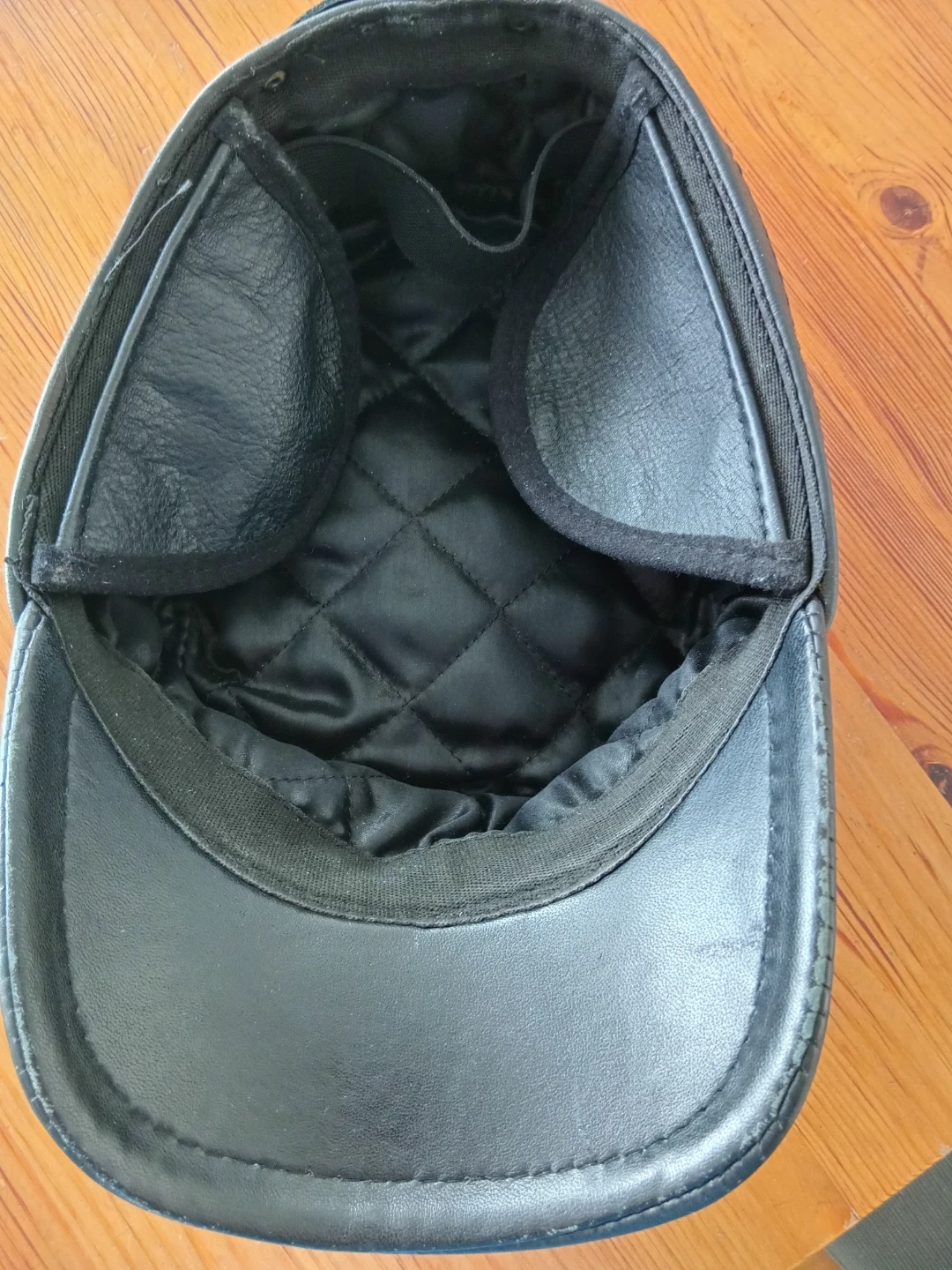 This black cap is made of leather and features a military-inspired design. It includes ear flaps that can be secured with a buckle. The inside is lined with quilted satin for comfort. It's a stylish accessory for cooler weather!
