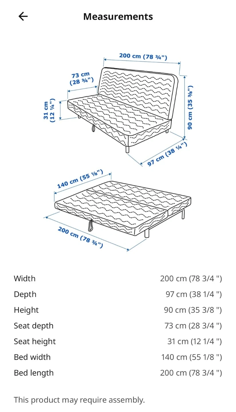 Converts into a bed with a width of 140 cm (55 1/8 ") and length of 200 cm (78 3/4 ")