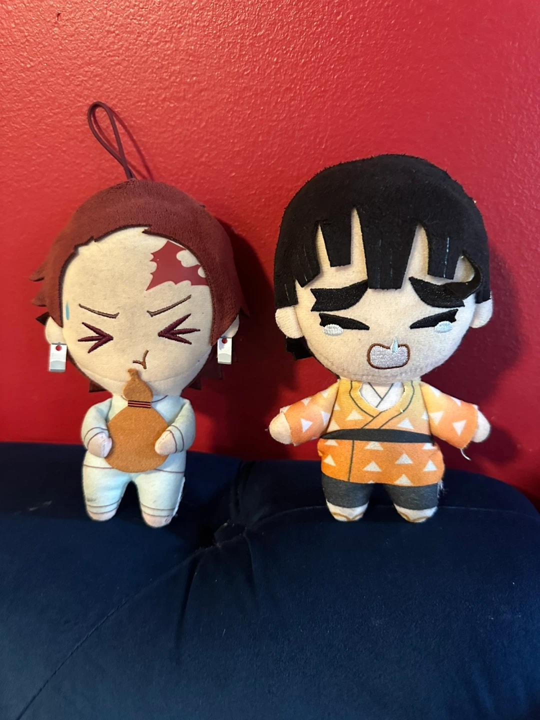 These are two plush dolls from the anime Demon Slayer. One features Tanjiro Kamado, and the other resembles Zenitsu Agatsuma. They're made of soft fabric and have embroidered details. Perfect for fans of the series!