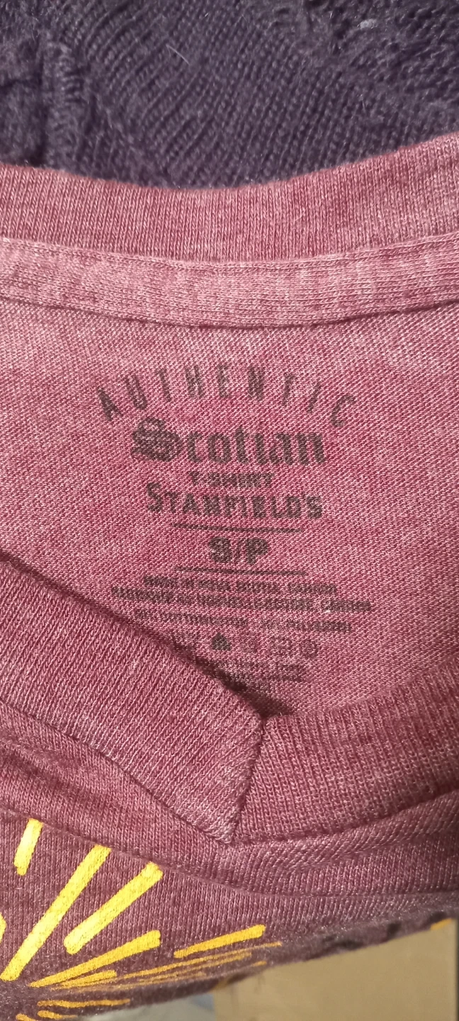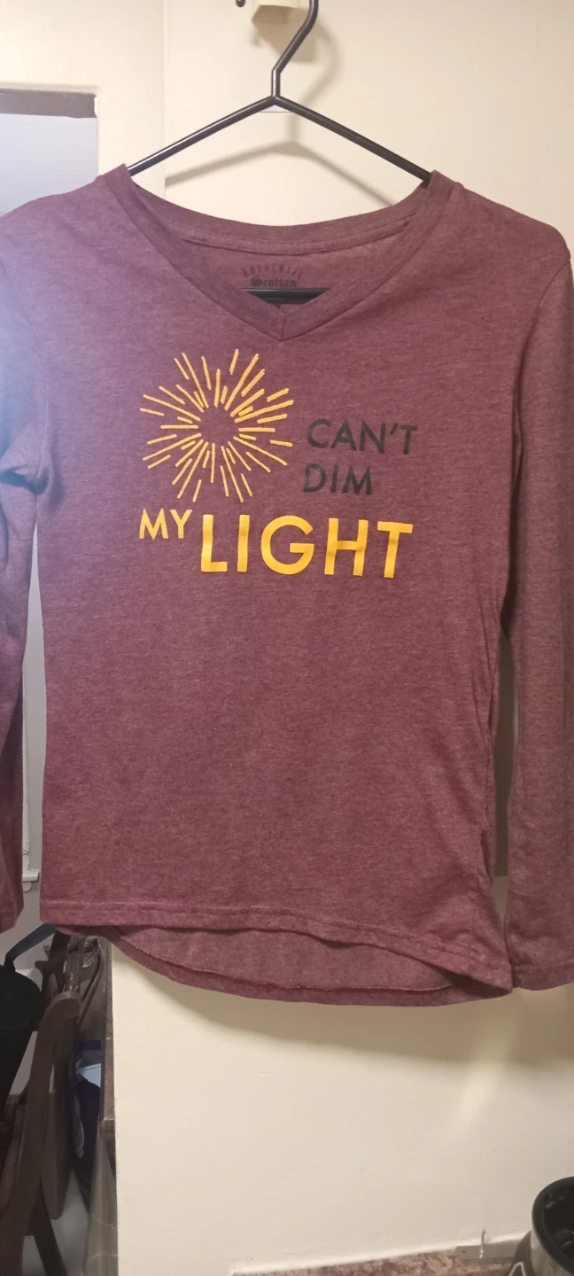 Authentic Cotton Stanfields long-sleeved V-neck t-shirt in a burgundy marled colour. It features a "Can't Dim My Light" graphic design. Made from a cotton blend.