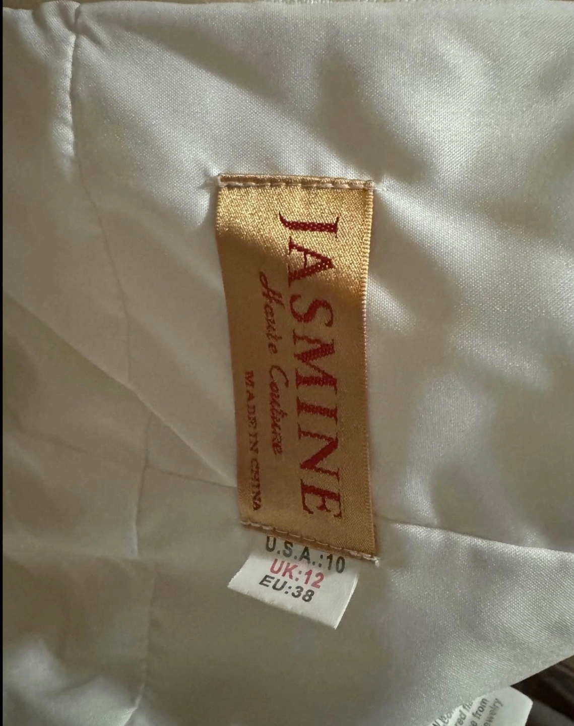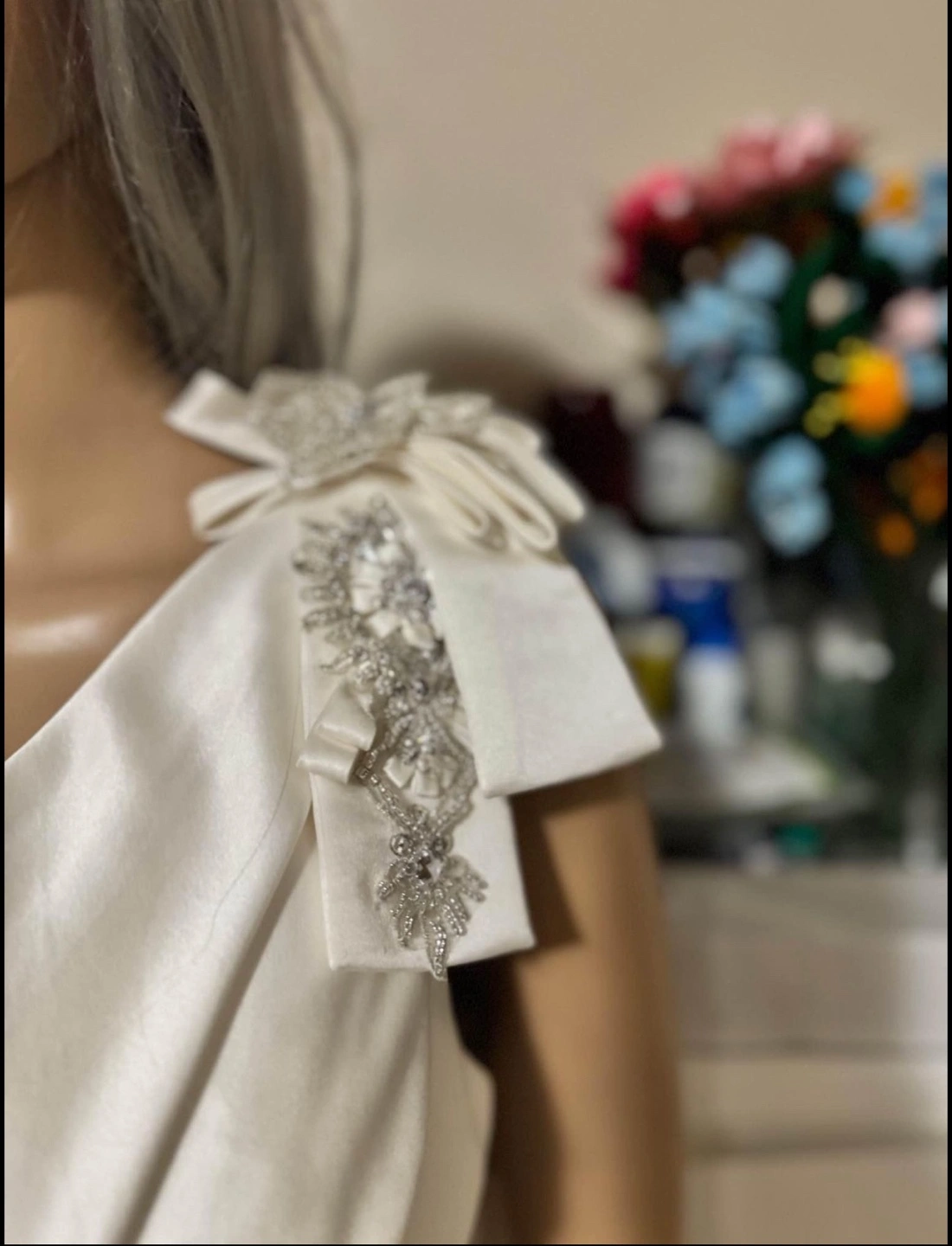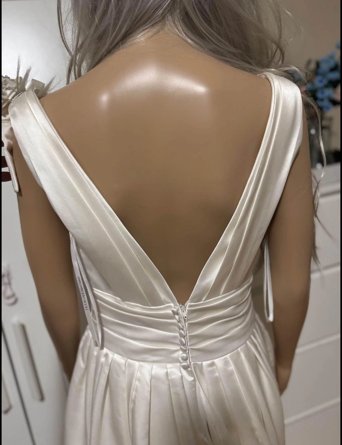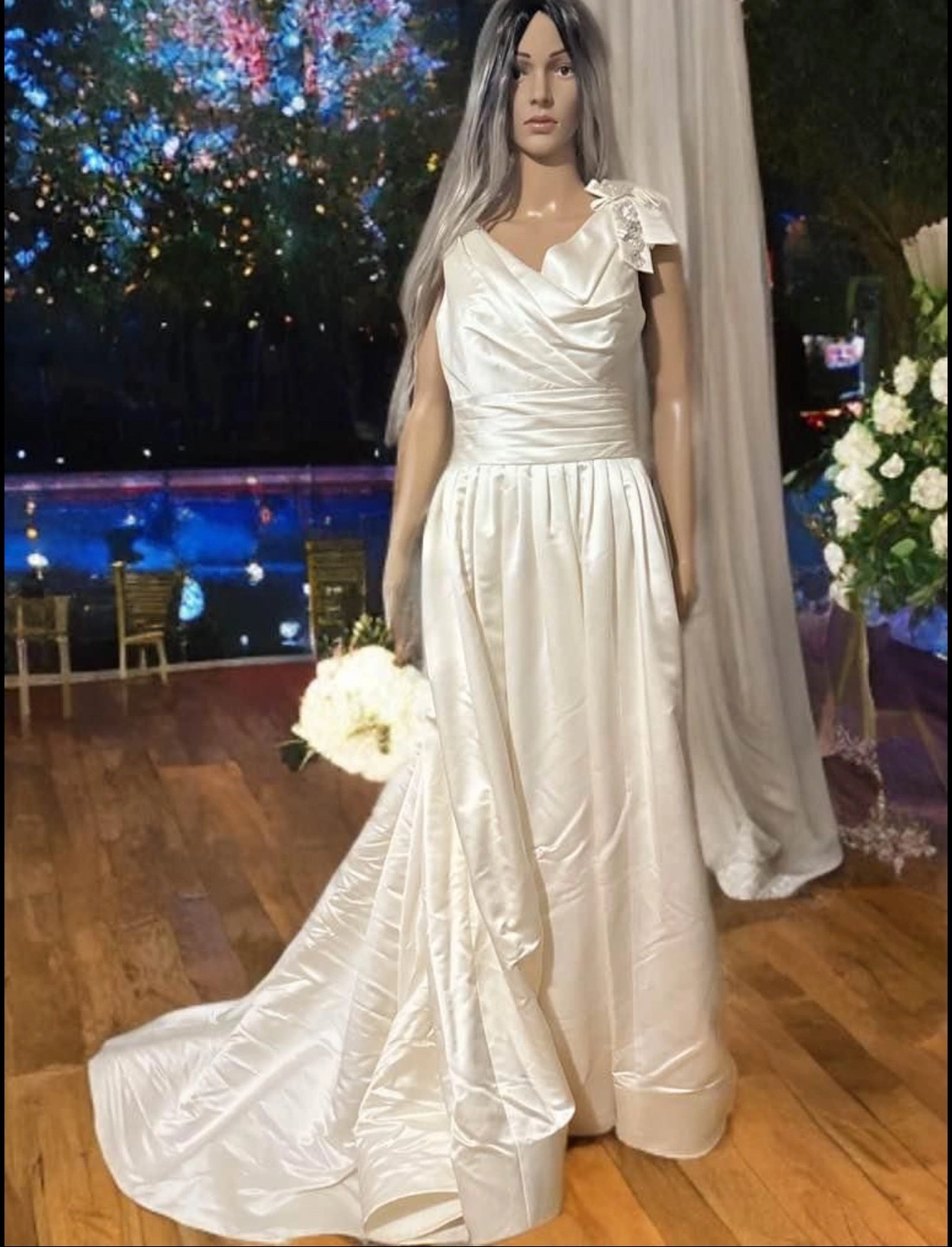 Beautiful ivory satin wedding dress. Features a draped bodice, pleated skirt, and a detachable embellished shoulder accent. Floor-length with a train.