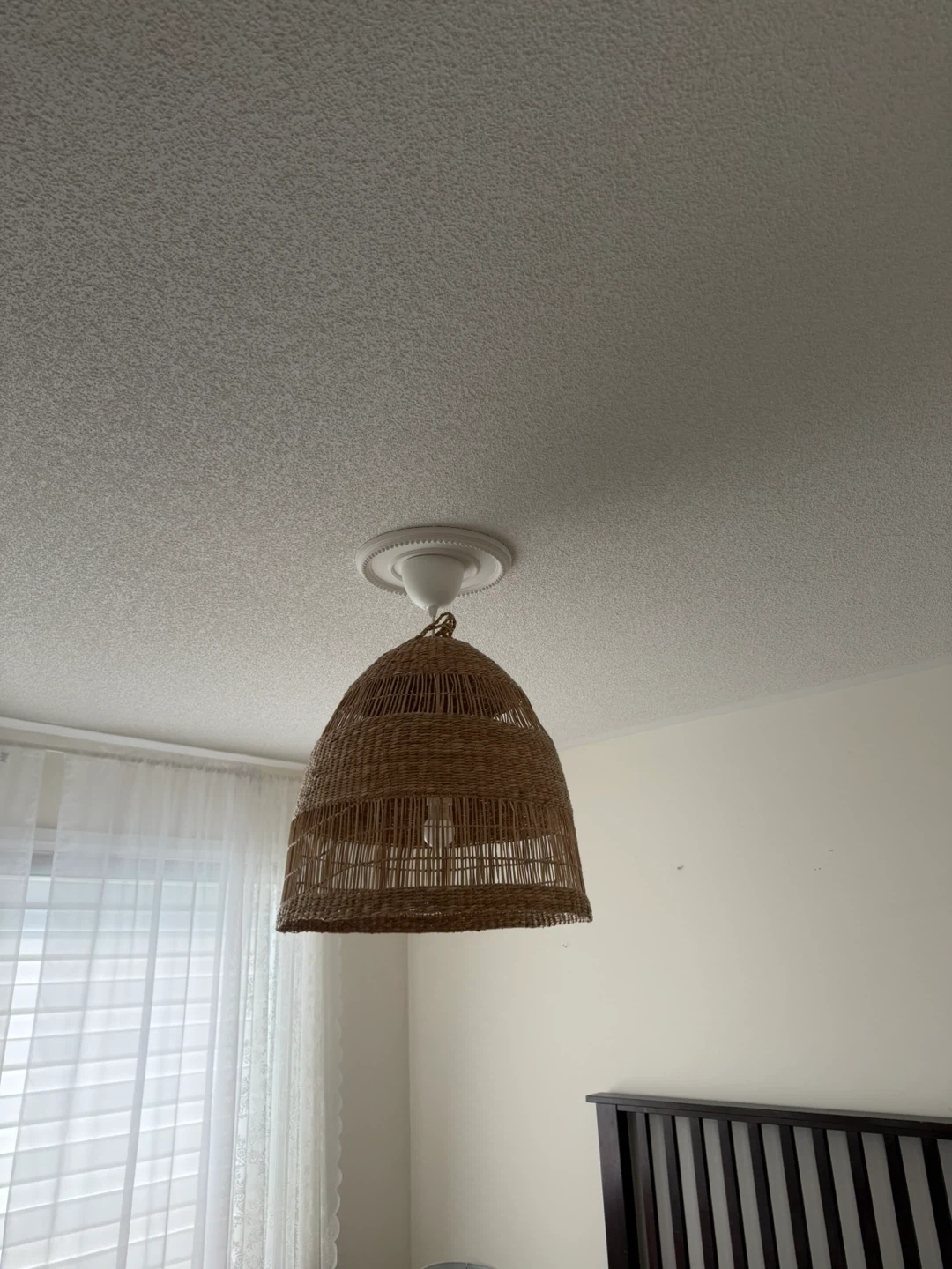 This is a natural woven pendant light shade. It's made from wicker and has a warm, earthy tone. It's perfect for adding a cozy, bohemian vibe to any room!