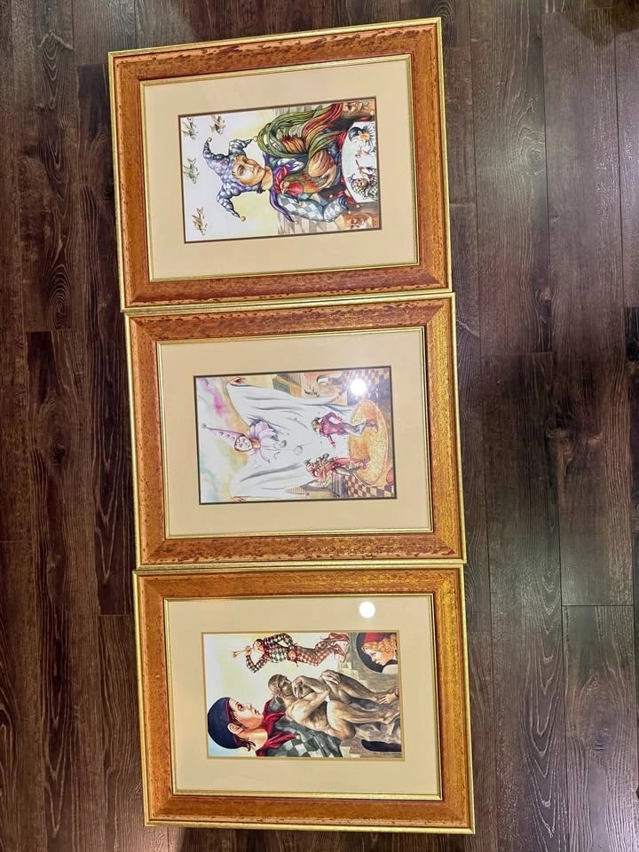 Beautiful coordinated set of three large framed art prints featuring whimsical Harlequin/Jester characters, inspired by European fantasy and Commedia dell’Arte style. Each piece is richly detailed with vibrant colours, expressive figures, and elegant composition.