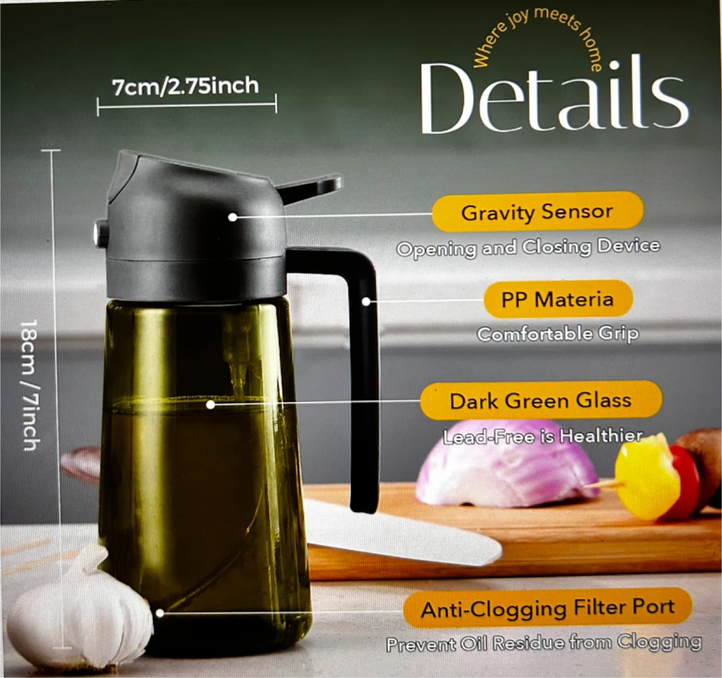 This YARRAMATE 2 in 1 oil sprayer and dispenser has a 470ml capacity. It's made with dark green, lead-free glass and features a comfortable grip and anti-clogging filter port. It also has a gravity sensor for opening and closing.