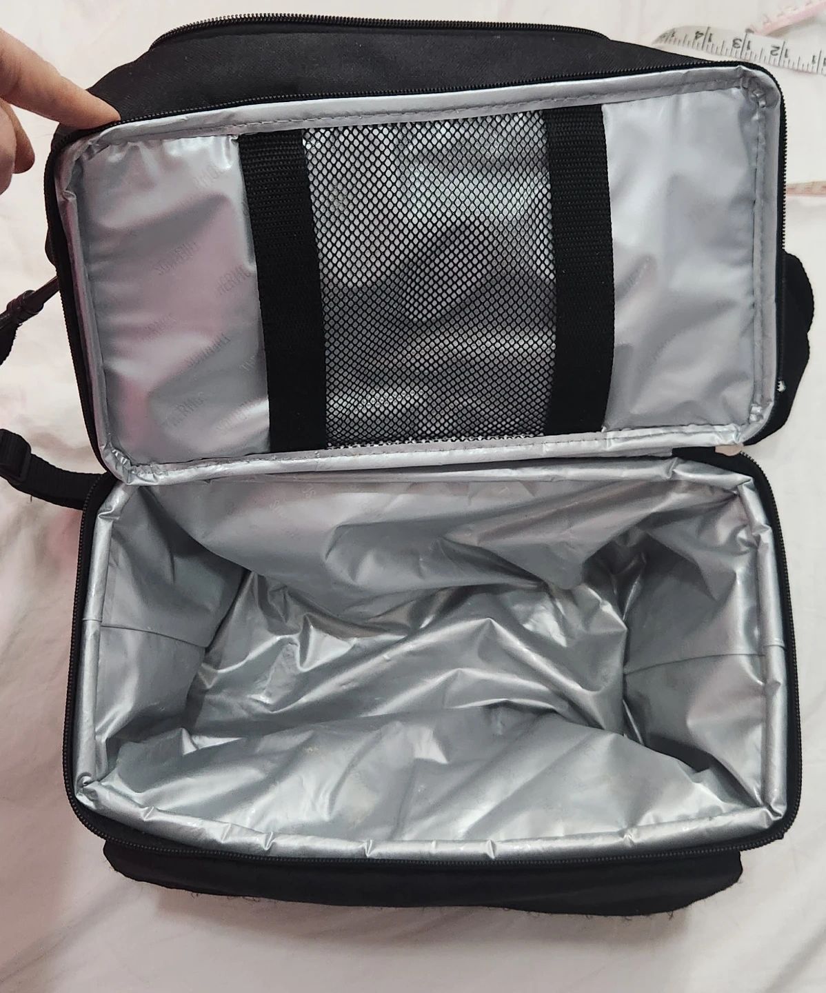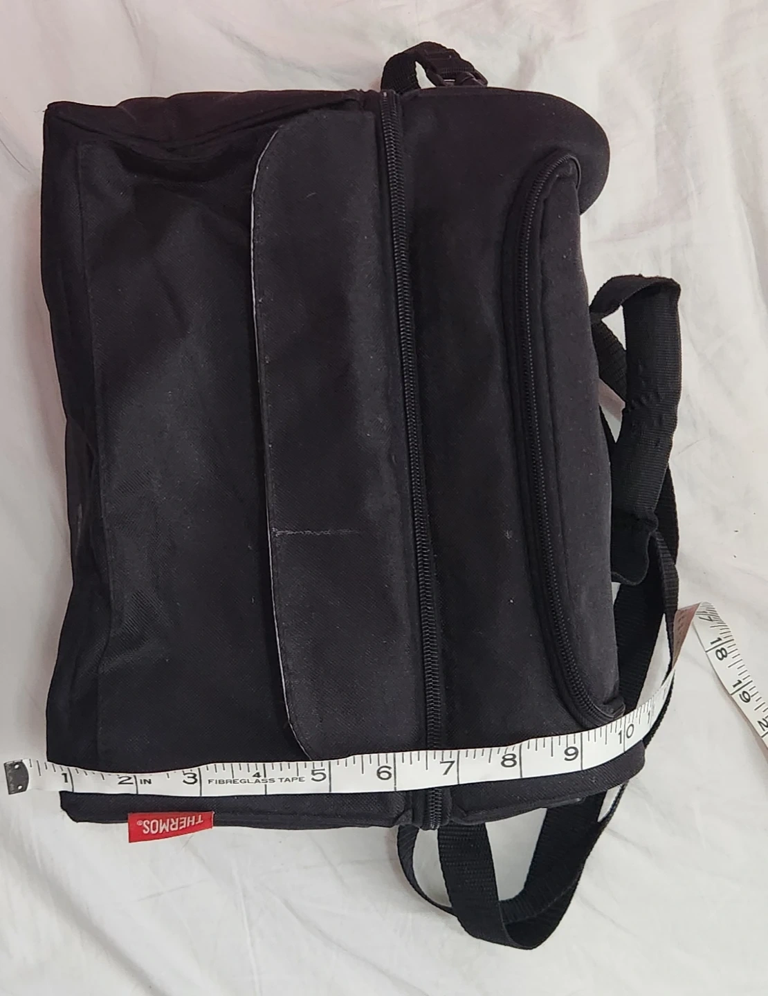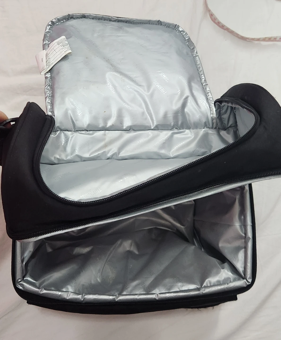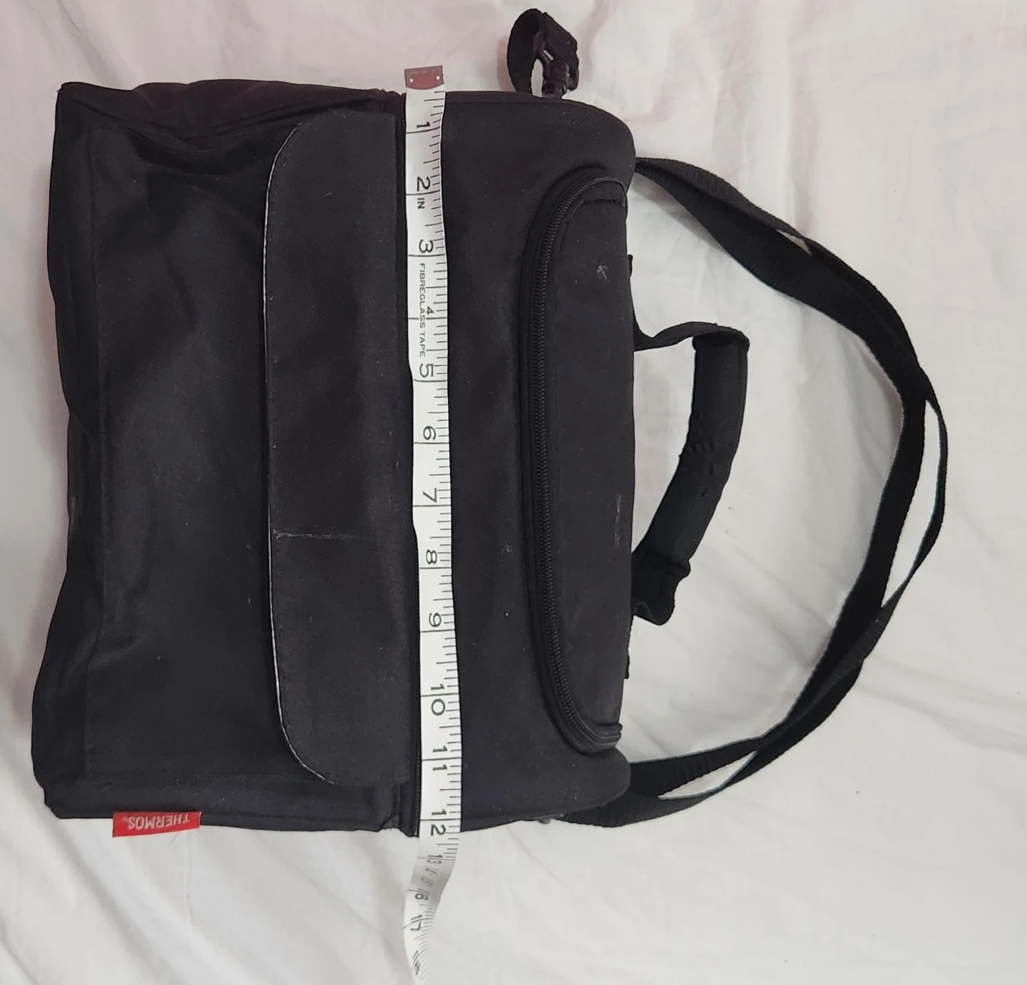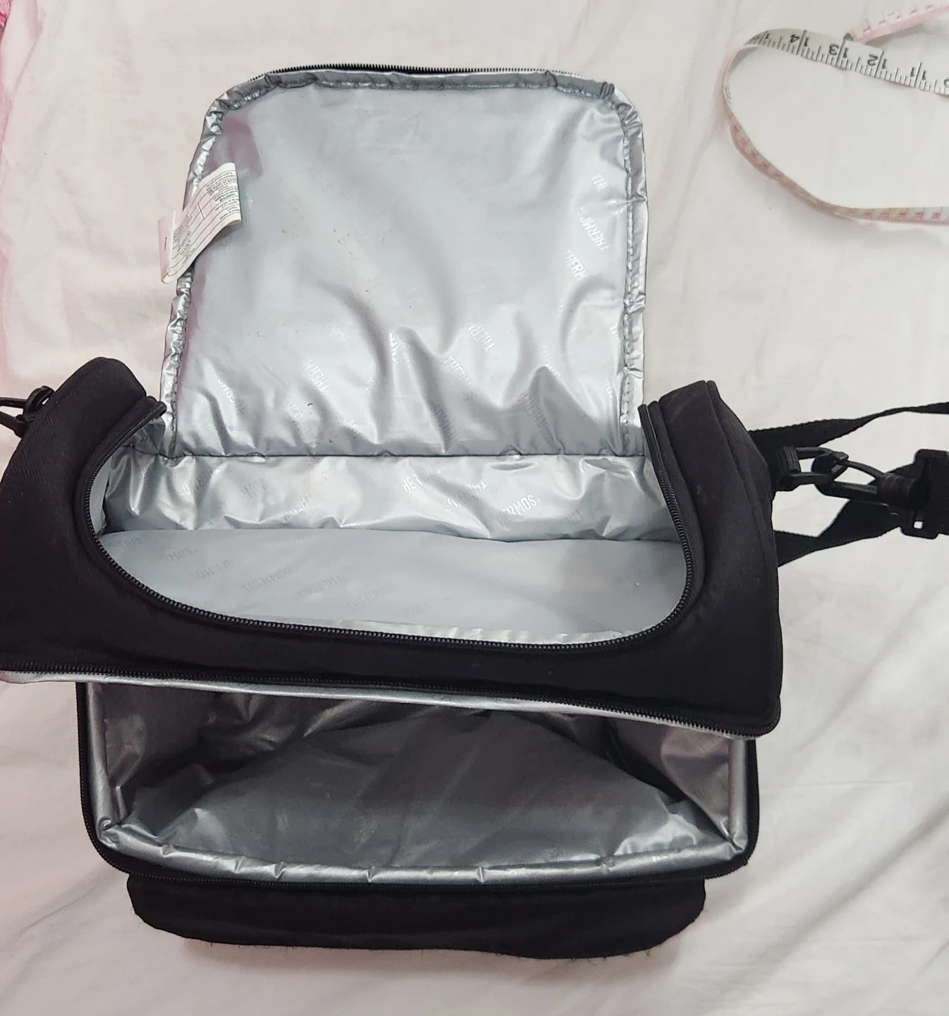 This is a black Thermos insulated lunch bag. It's made of durable fabric with a zippered main compartment. Interior is insulated to keep food and drinks cool.