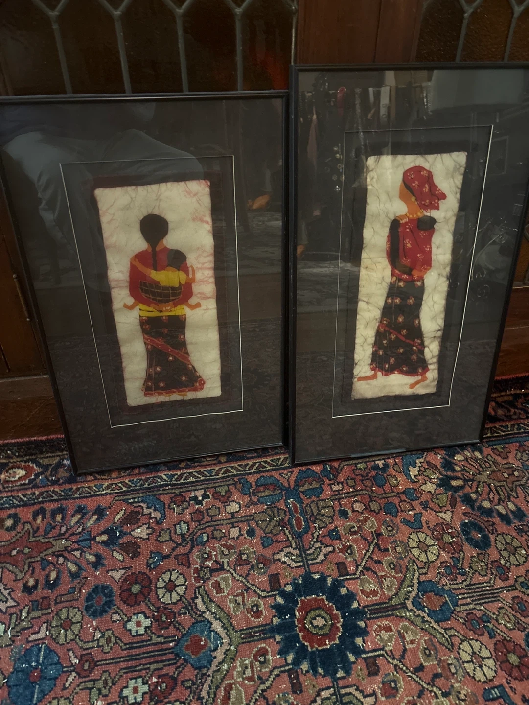 Two framed batik art prints depicting women in traditional attire. These pieces showcase intricate fabric designs. Adds a cultural touch to any wall!