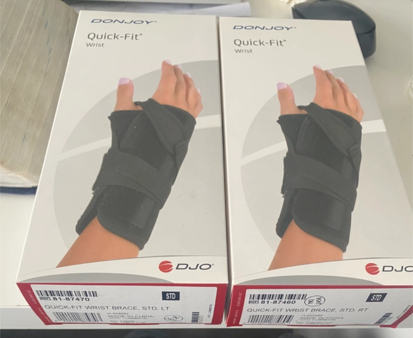 This listing is for two DonJoy Quick-Fit wrist braces, one for the left wrist and one for the right. They are standard size and designed for wrist support. The braces are made in China.