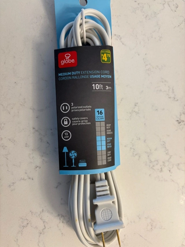 Brand: Globe Length: 10ft / 3m 16-gauge, 13 AMP 3 polarized outlets with safety covers Perfect for indoor use — ideal for lamps, fans, computers, chargers, and more. New in package. Pickup in Burlington. Smoke-free home.