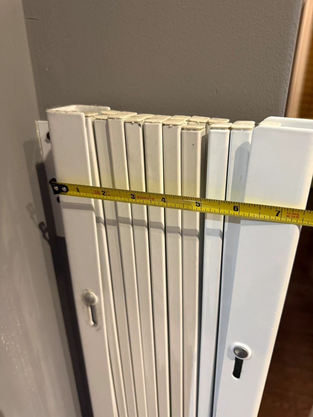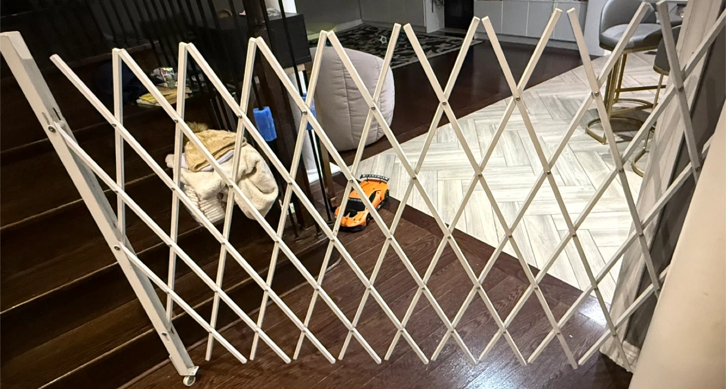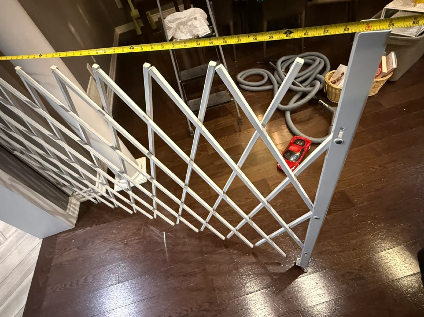 Expandable white metal gate. Wall mount style with wheels on one end. Great for stairs or wide openings. Extends 7.5-64 inches long 47.25 inches height