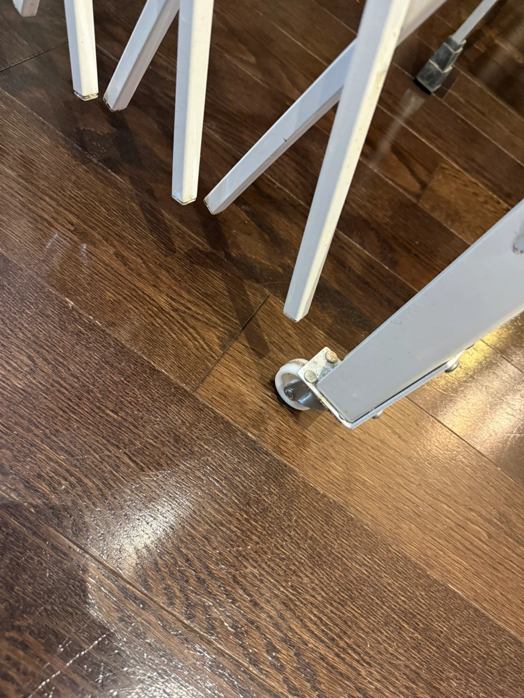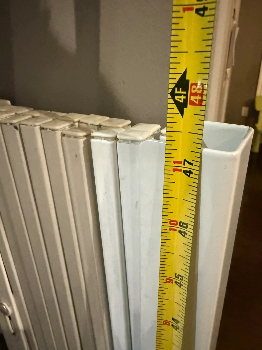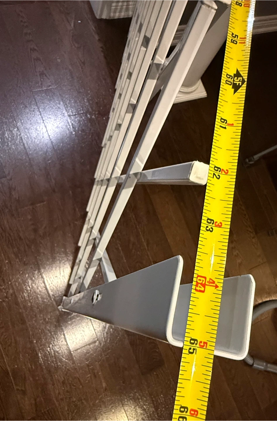Expandable white metal gate. Wall mount style with wheels on one end. Great for stairs or wide openings. Extends 7.5-64 inches long 47.25 inches height