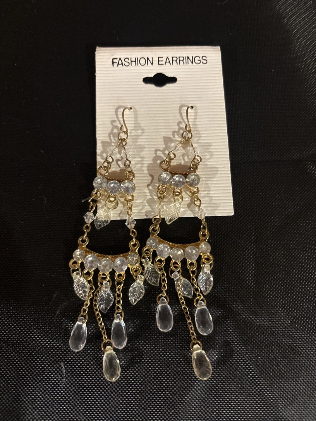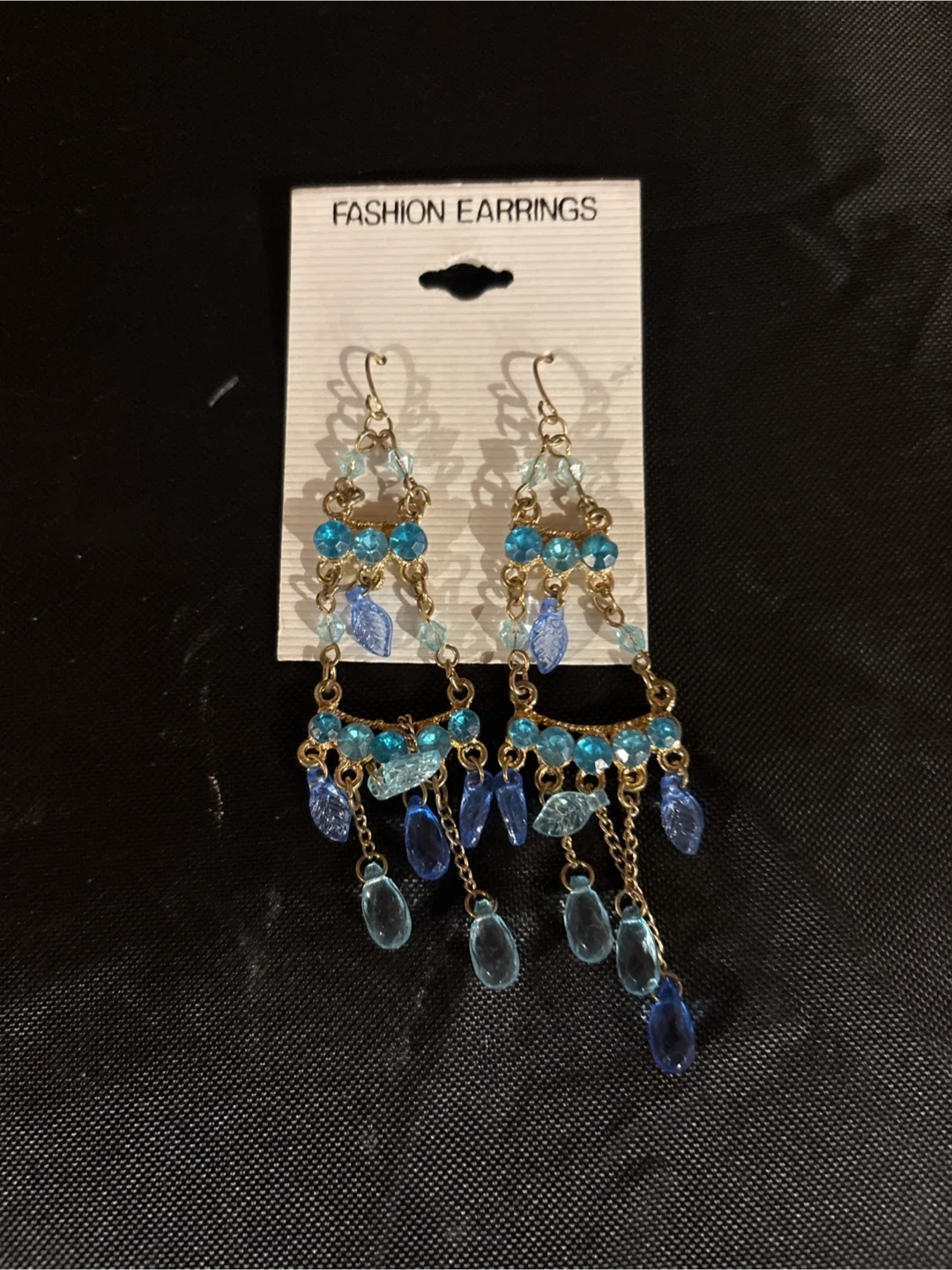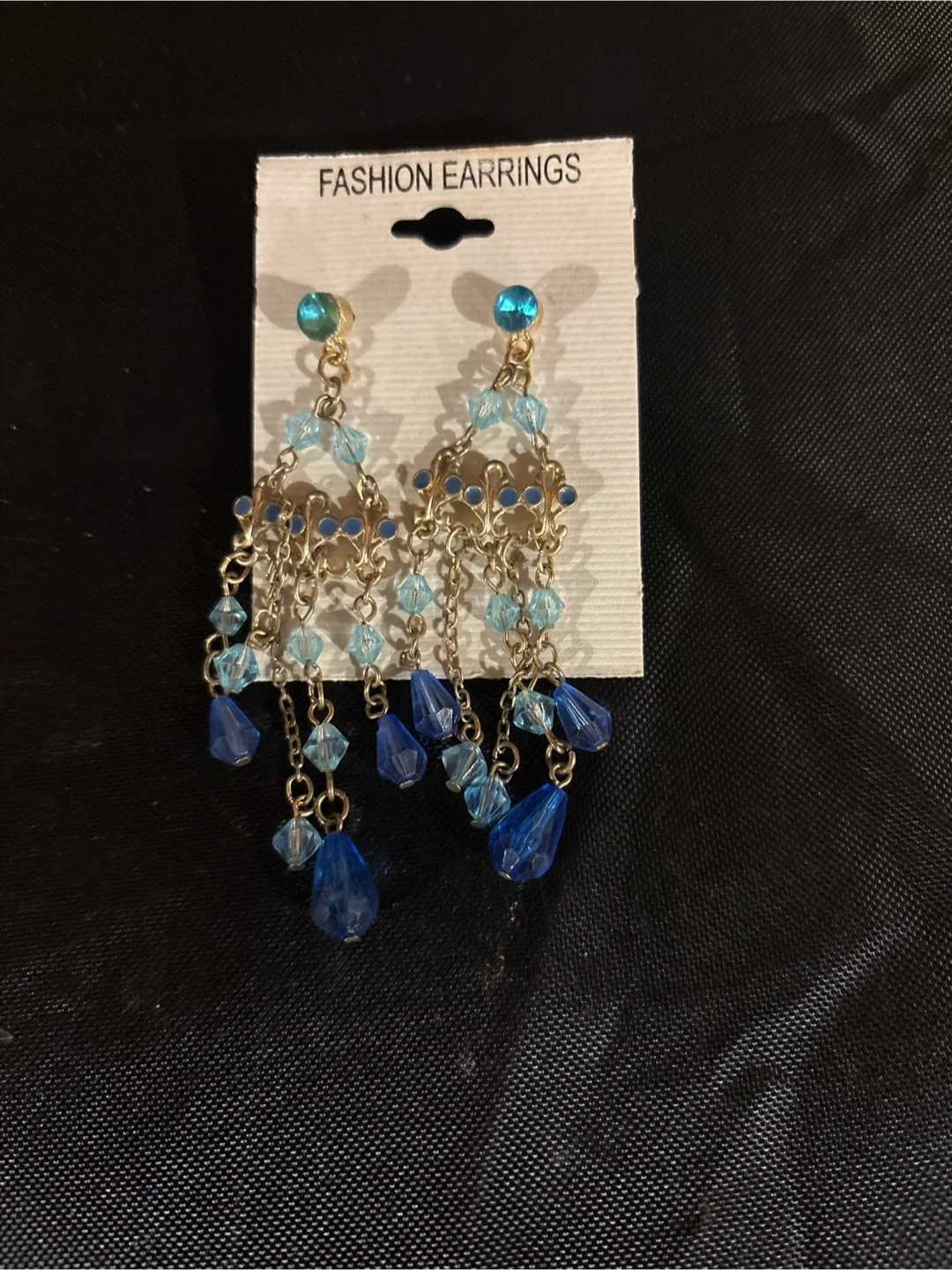 Set of fashion earrings featuring gold-tone metal. Some styles have clear accents, while others include blue and turquoise beads. All are dangle or chandelier style and come on original carding. They're beautiful statement pieces! Good for bridal party!! $5 each or all 8 for $25