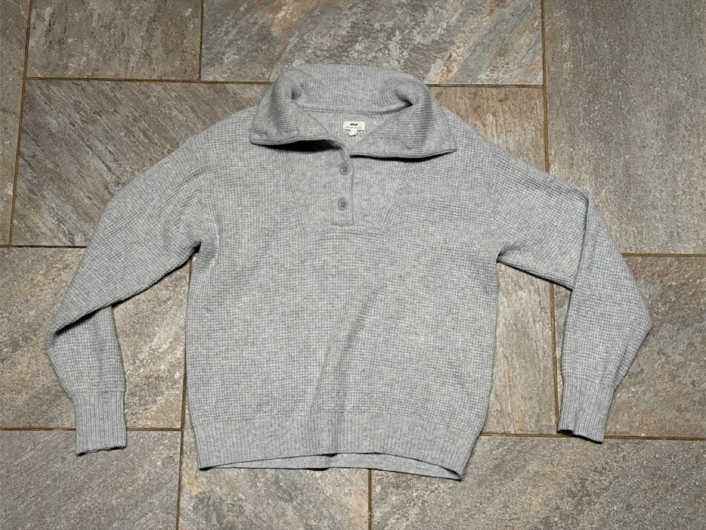 This is an Aerie grey waffle knit sweater. It's a size small with a collared neck and button details. Made from a comfortable knit material.