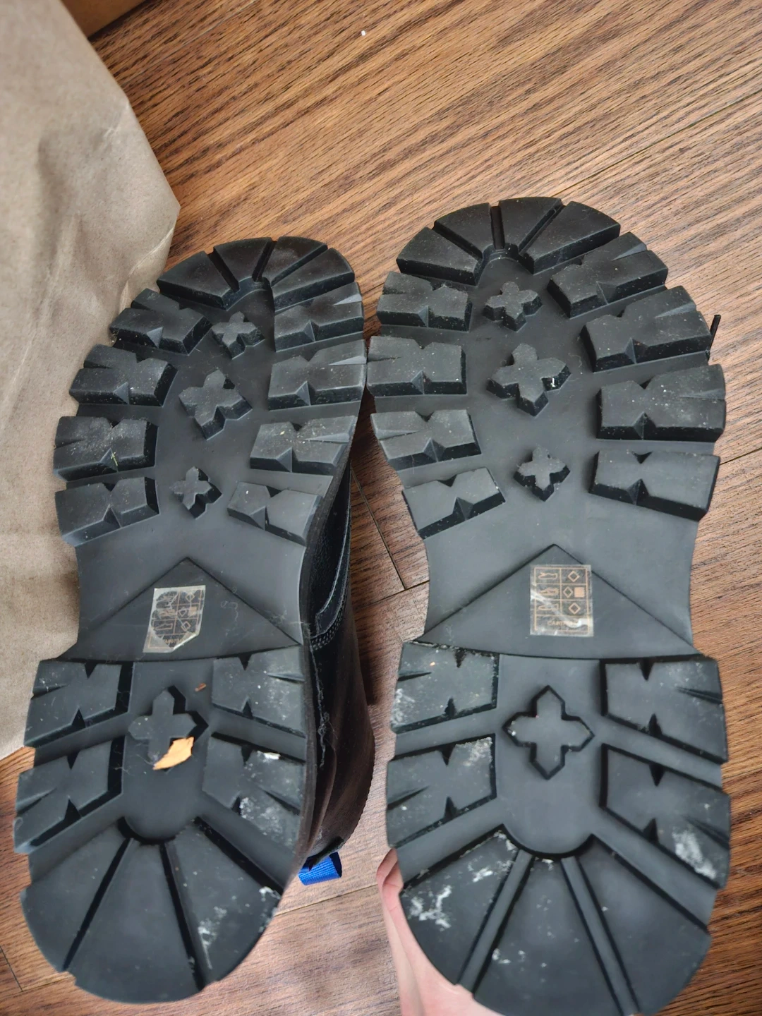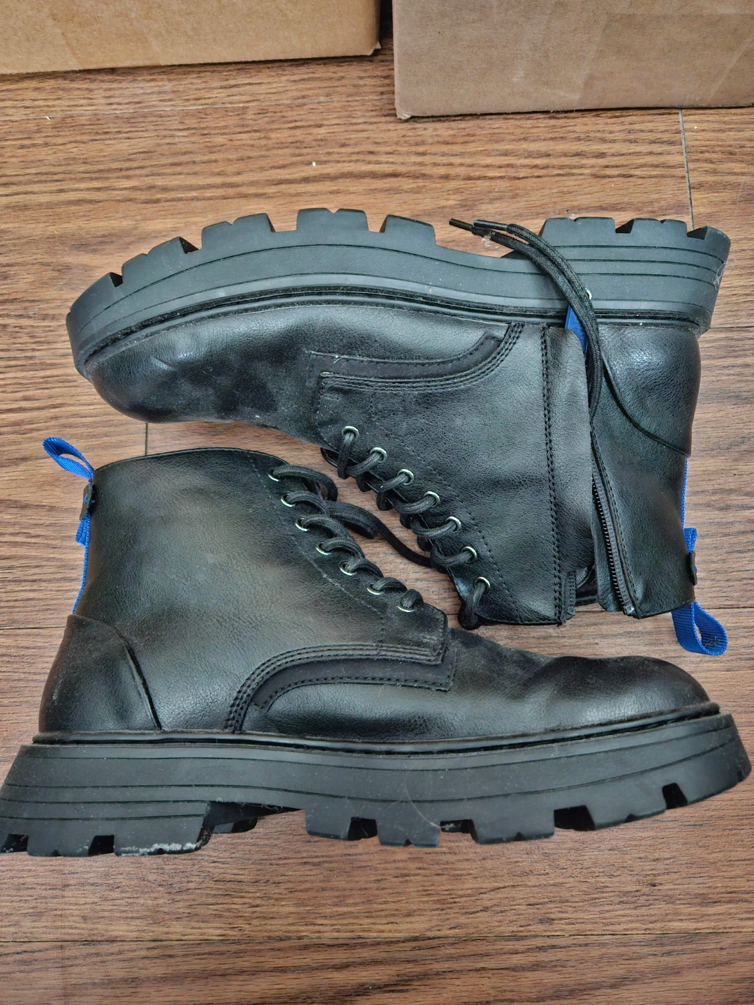 DKNY combat boots in black. US size 9.5M, EU size 42.5D, UK size 8.5M. Man-made upper, textile lining. Features a side zipper and blue pull tabs.