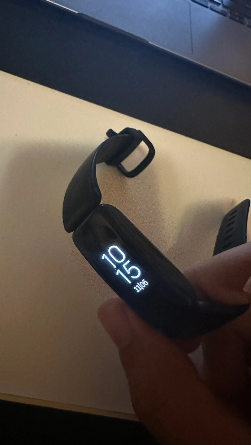Black fitness tracker with a black band. Comes with charging cable.