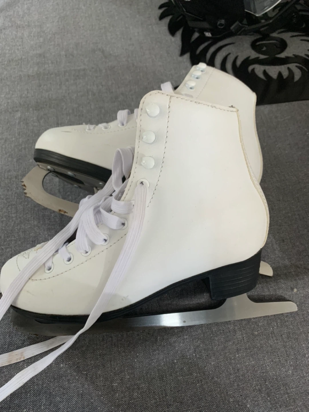 These are white figure skates with laces. They have metal blades for gliding on the ice. Great for learning to skate! Size 3 and size 2