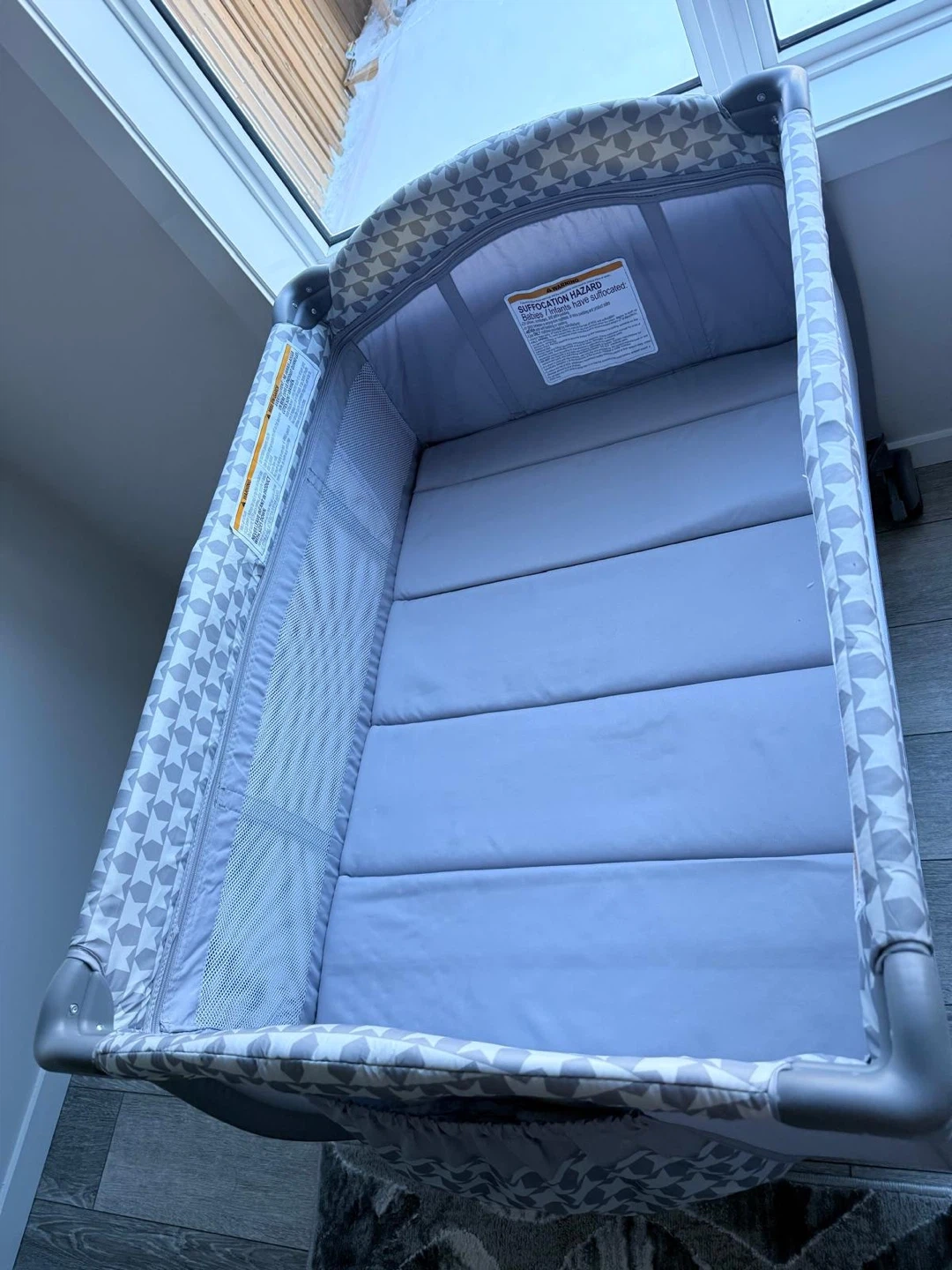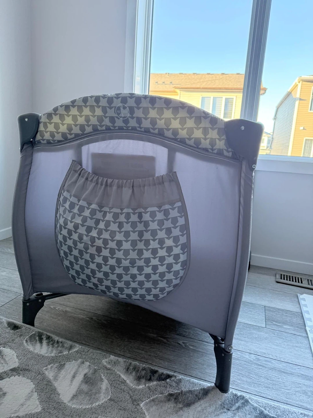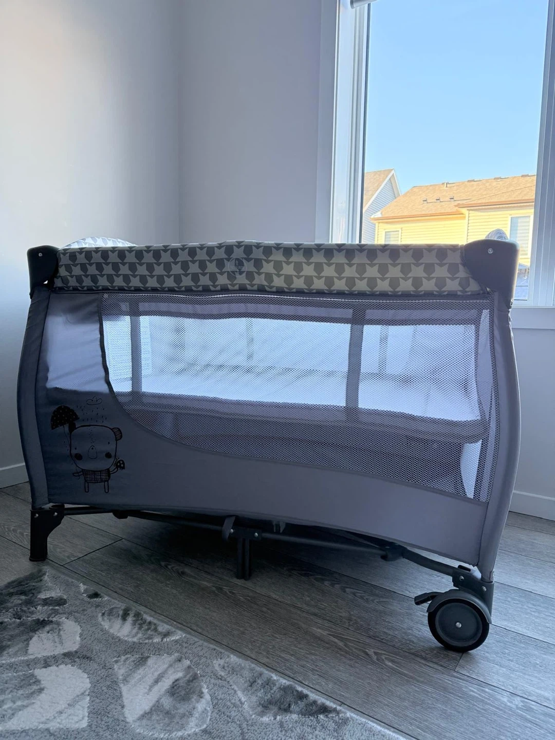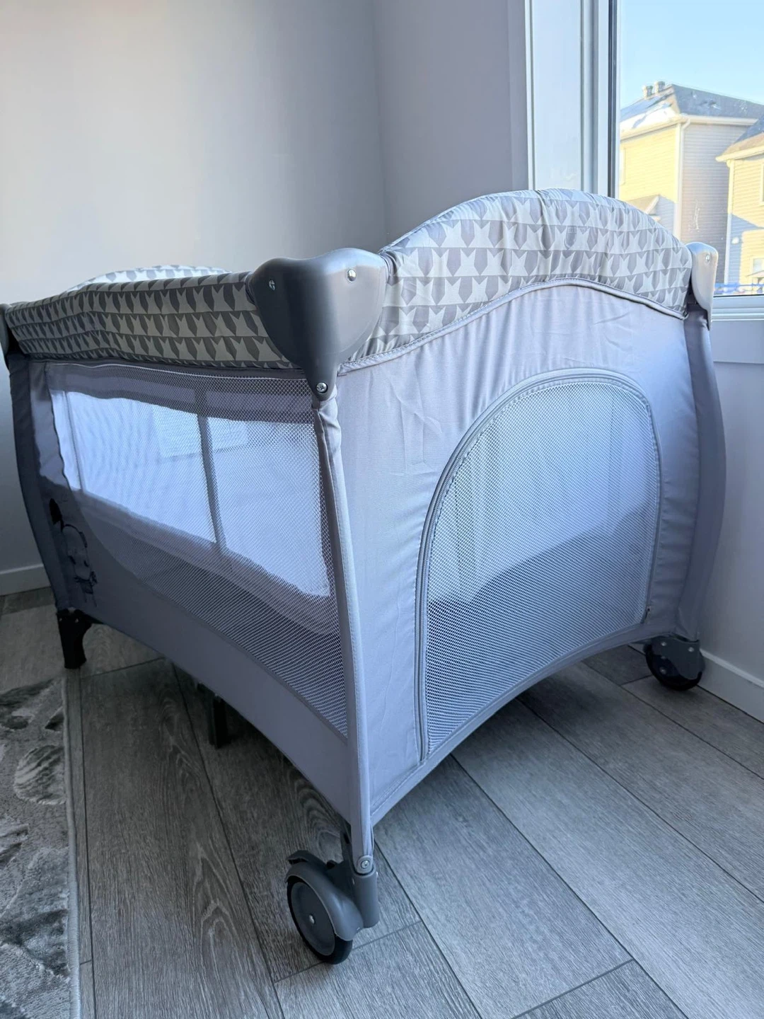 Portable baby playpen / travel crib in excellent condition. Very clean and sturdy, with breathable mesh sides and wheels for easy movement. Folds easily for storage or travel.