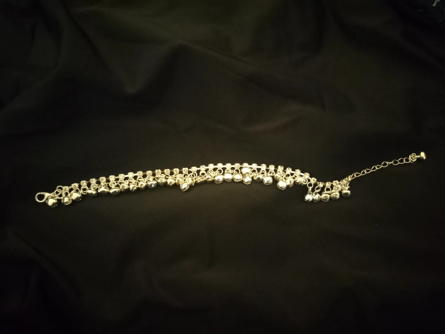 A lovely silver-tone anklet featuring a delicate chain adorned with small bells. It's adjustable for a comfortable fit. This anklet adds a playful chime to your step!